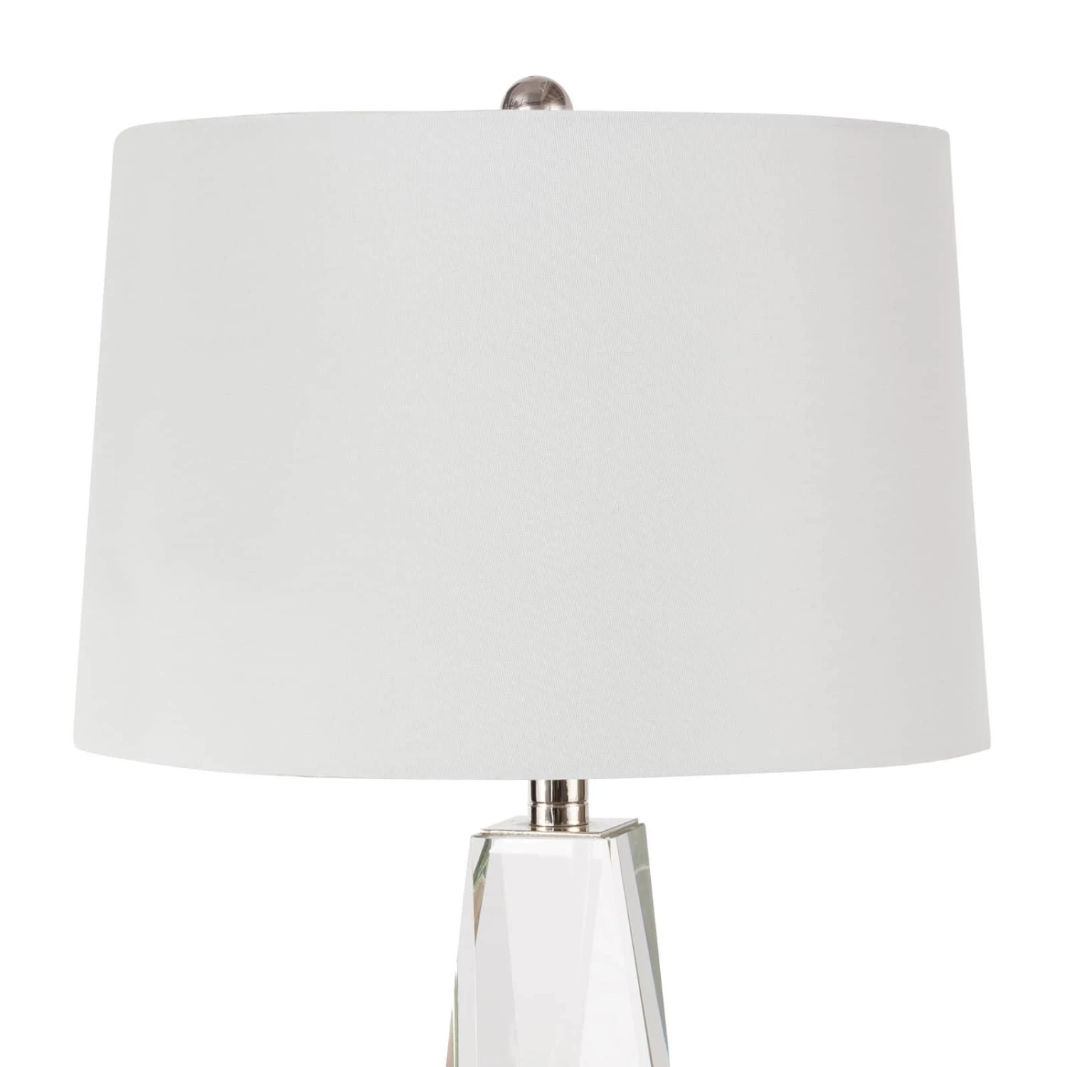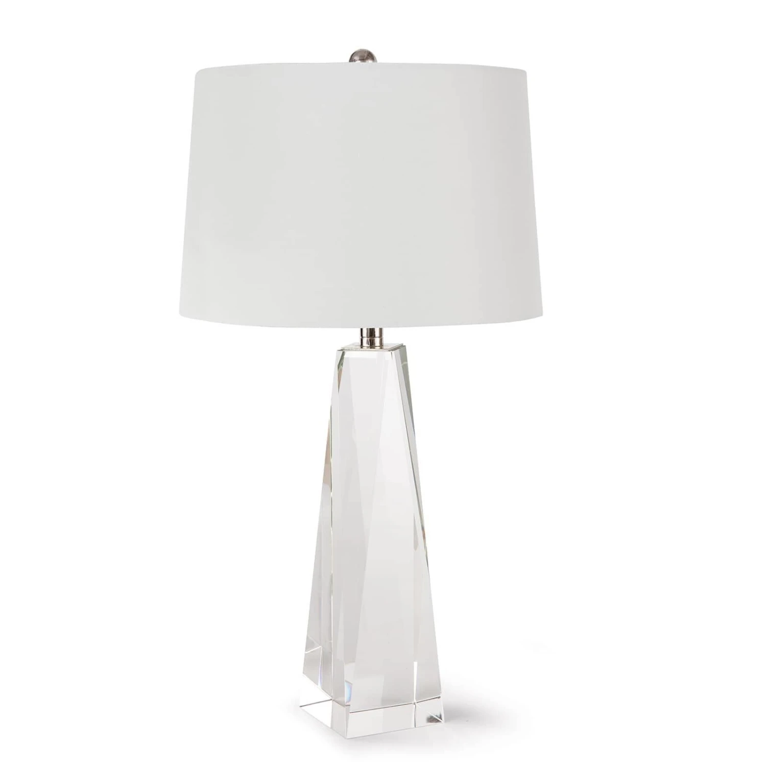 The Angelica Table Lamp is crafted of solid hand polished crystal, fitted with polished nickel hardware and topped with a natural linen tapered shade. This clear and sculptural lamp lends itself to a variety of settings, making it a versatile option for the living room, bedroom, or sitting room.