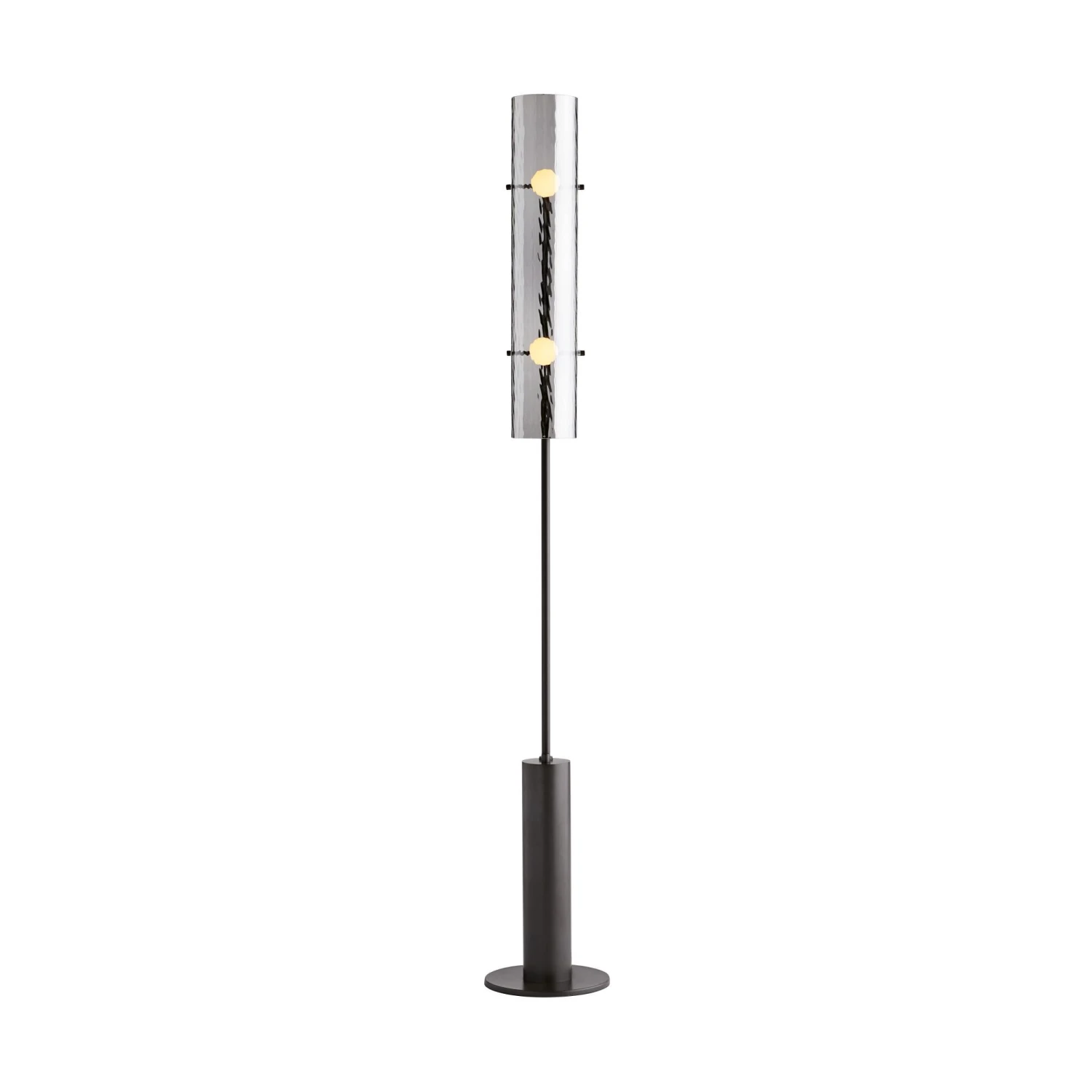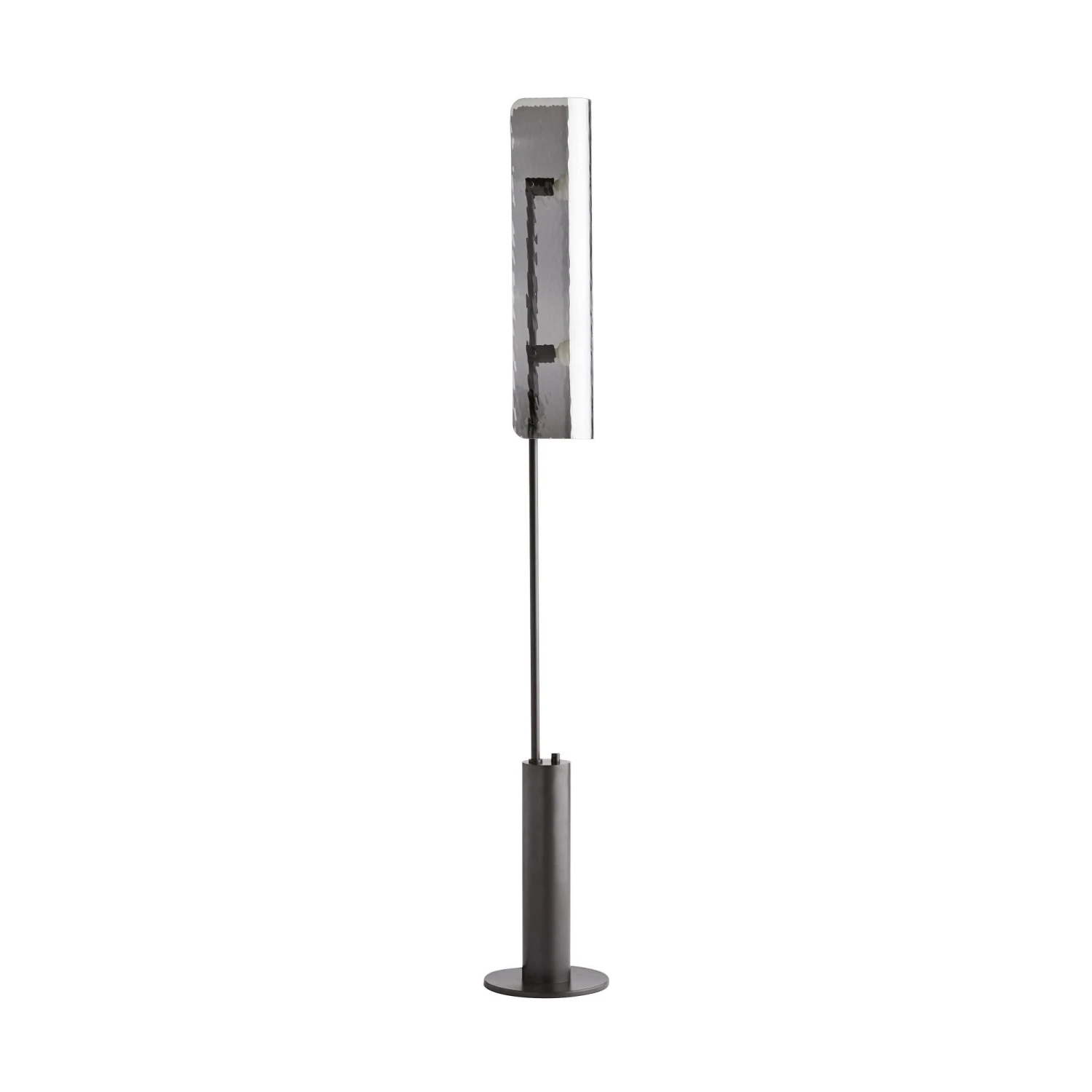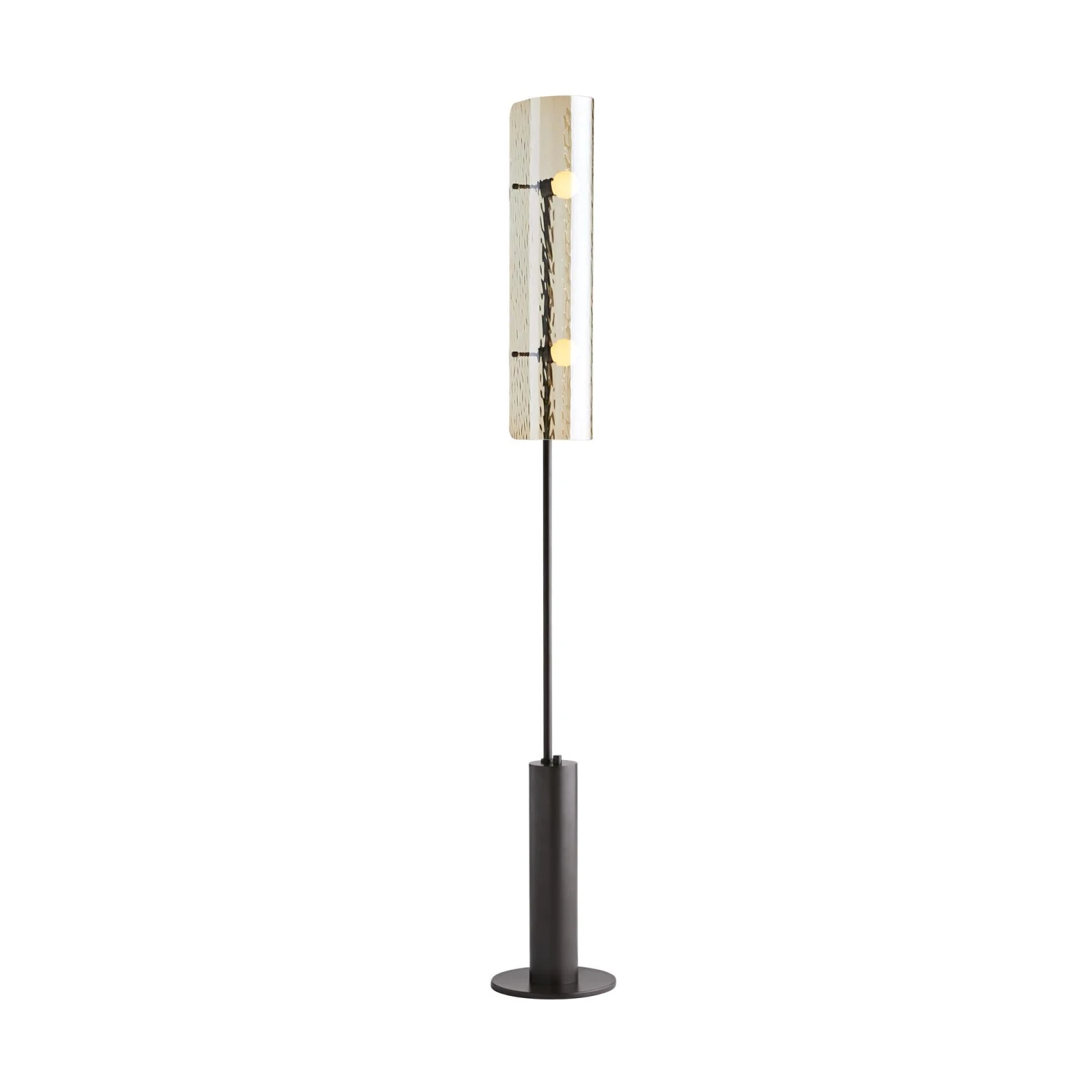 The freestanding Bend Floor Lamp casts dynamic patterned light through a long, narrow half-cylinder of rippled smoke glass. A celebration of the subtle variations of hand-blown glass, Bend’s textural floating shade – available in silvery grey Smoke and warm Amber glass – is held by a slender blackened steel base, creating a bold interplay of materials and directional forms.