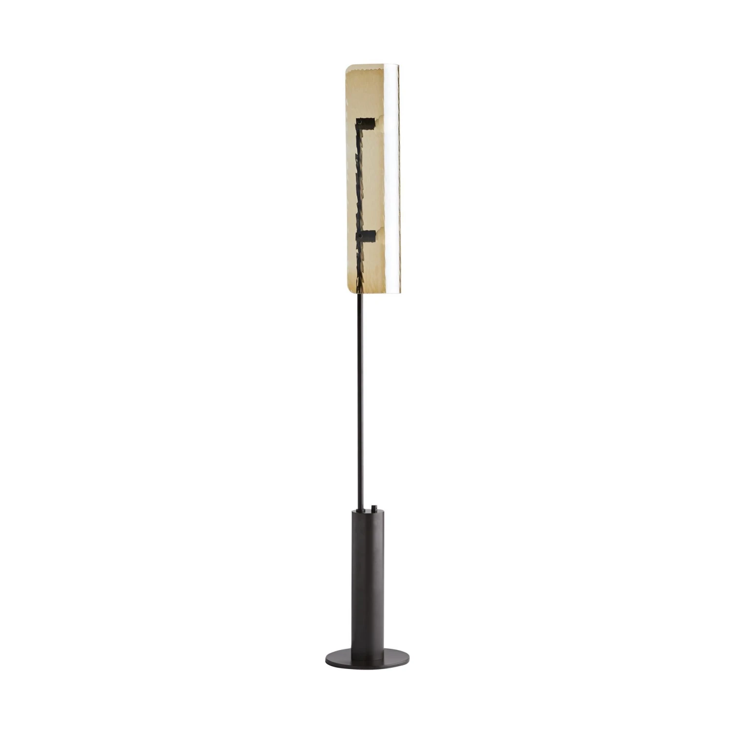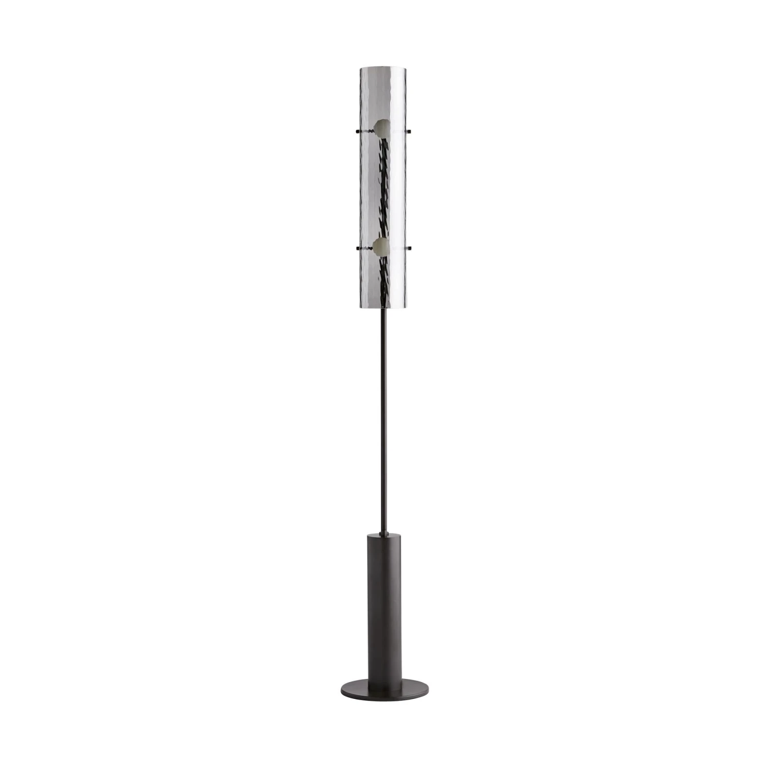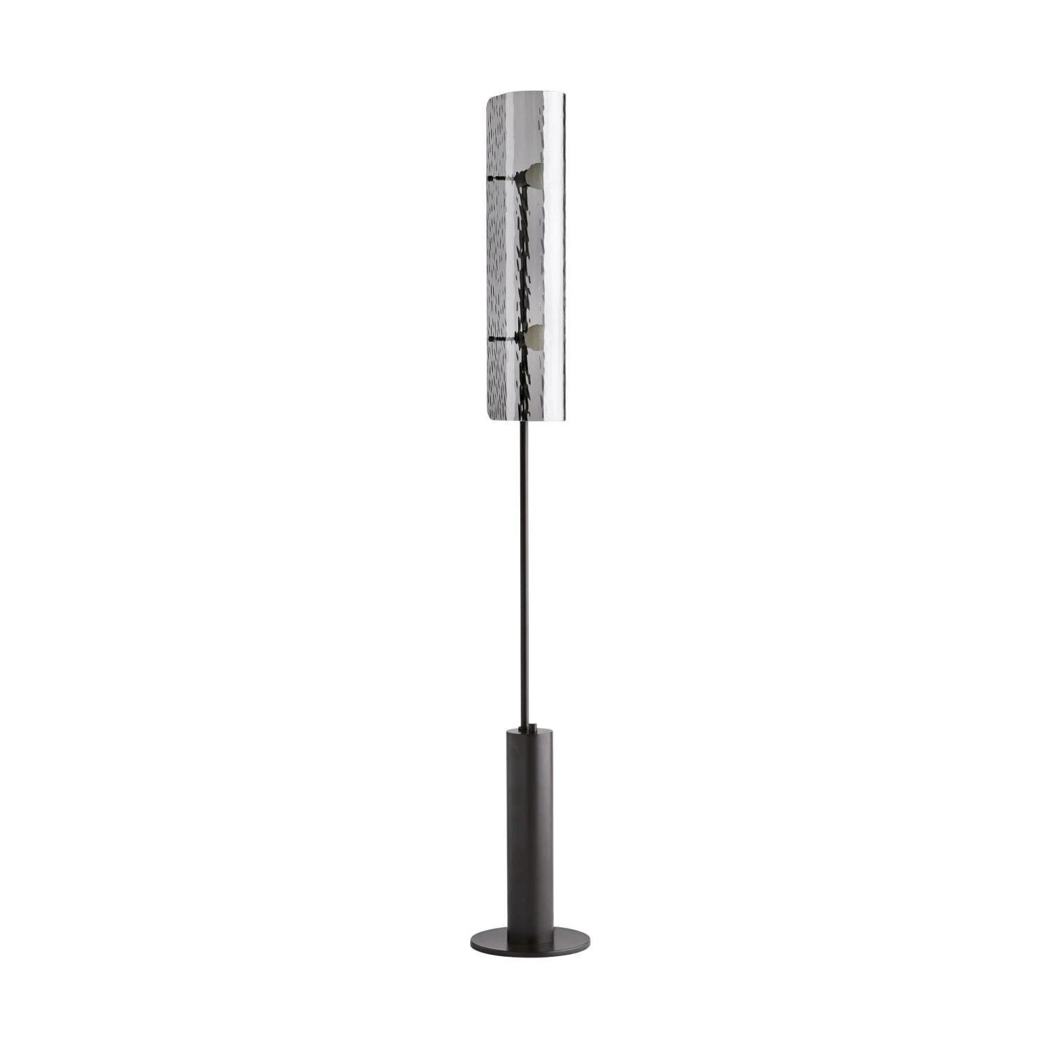 The freestanding Bend Floor Lamp casts dynamic patterned light through a long, narrow half-cylinder of rippled smoke glass. A celebration of the subtle variations of hand-blown glass, Bend’s textural floating shade – available in silvery grey Smoke and warm Amber glass – is held by a slender blackened steel base, creating a bold interplay of materials and directional forms.