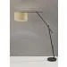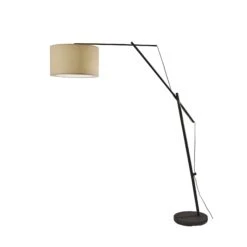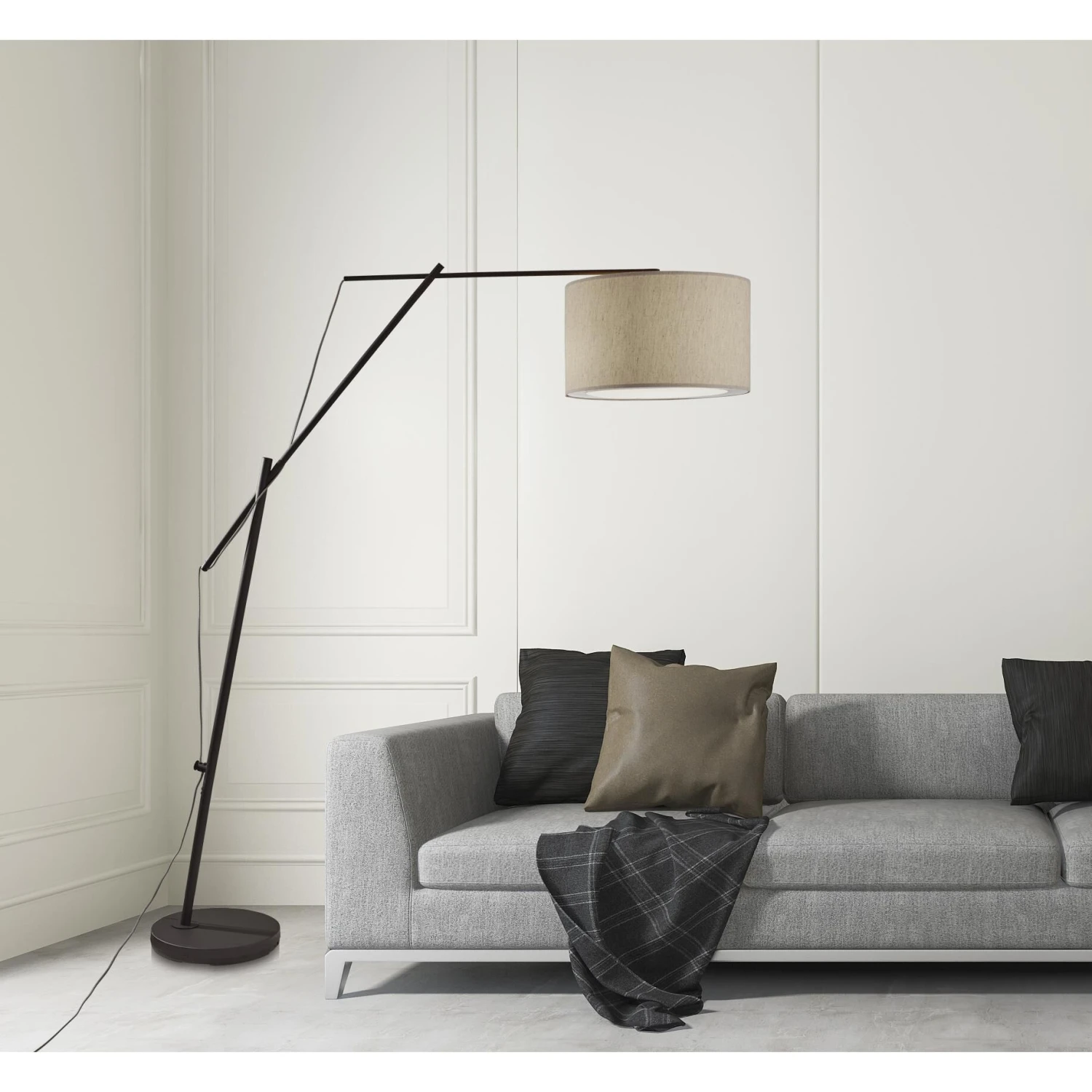 Get light right overhead in your living or dining area with the Broome Arc Floor Lamp. With an architect arching sikhouette this lamp is perfect for industrial modern settings. A rough matte black finish is both versatile and unique. A warm textured beige linen fabric shade provides a nice contrast to the contemporary styling. A white diffuser allows for an even glow illuminating the area. A black and white fabric covered cord trails neatly from a hefty stabilizing base and houses a convenient foot step switch turning the lamp on and off.