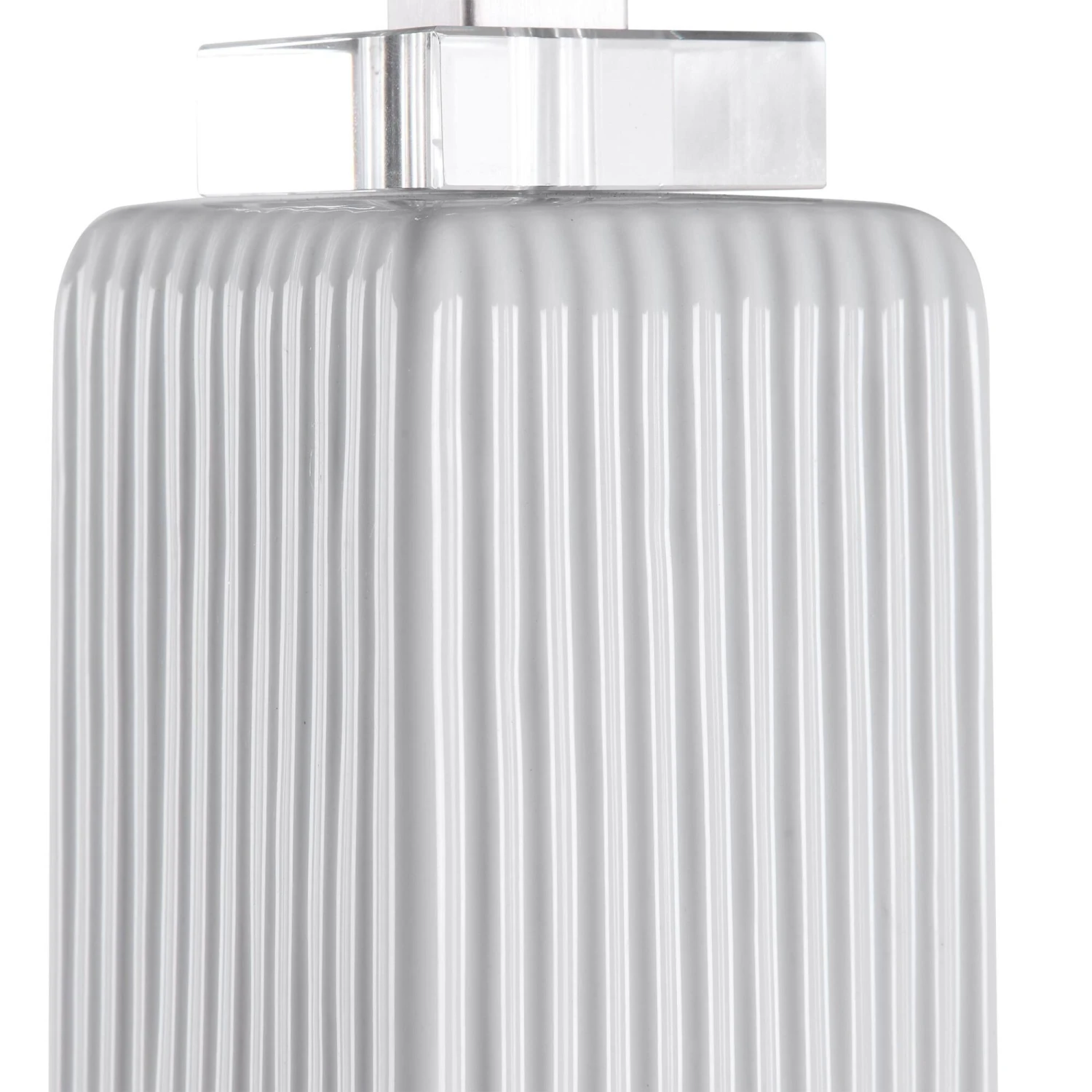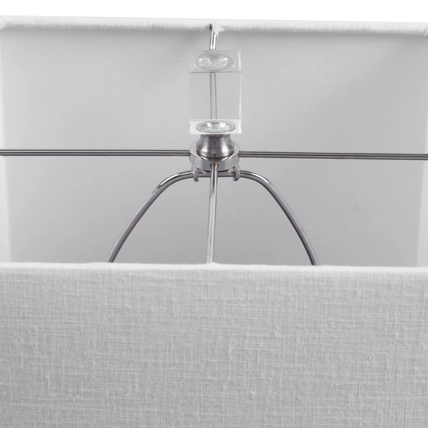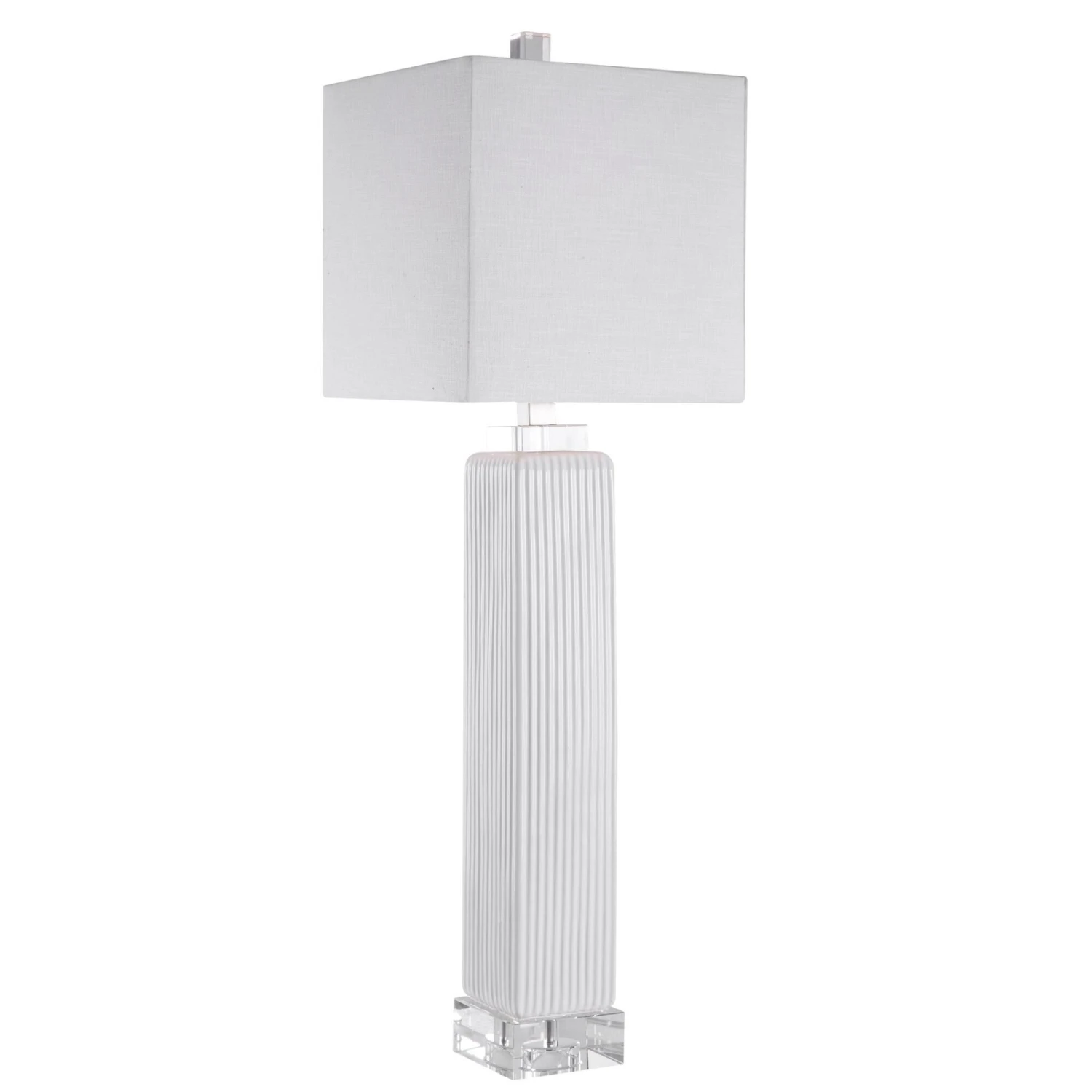 Showcasing A Refined Transitional Style, This Buffet Lamp Can Be Easily Placed With Its Square Ribbed Base Finished In A Gloss White Glaze, Paired With Thick Crystal Details And Brushed Nickel Accents. The Square Hardback Shade Is An Off-white Linen Fabric With Natural Slubbing.