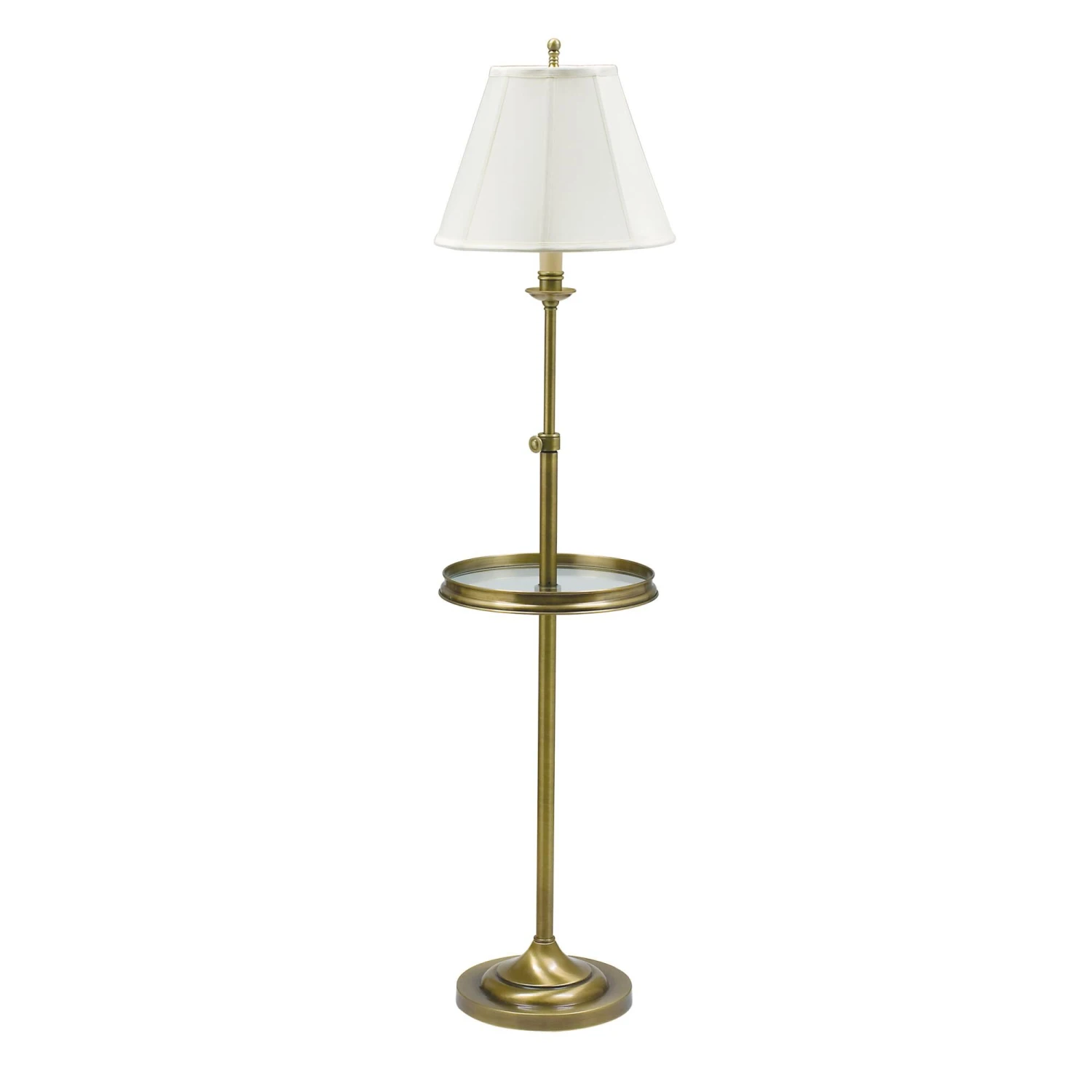 Base dimension is 10 inches in diameter. Shade dimensions are 6.5 inches by 13 inches by 10 inches. Fixture comes with a 10 foot clear cord. The height of this lamp is adjustable.