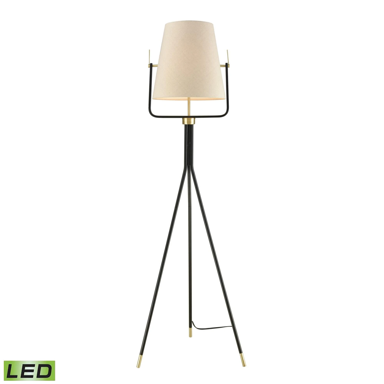 The Cromwell Floor Lamp adds a midcentury note to contemporary living rooms, bedrooms or hallways. Its functional, metal tripod frame comes in black with aged brass detailing and holds a round, hardback shade in white faux silk. This design features a foot switch for added convenience.