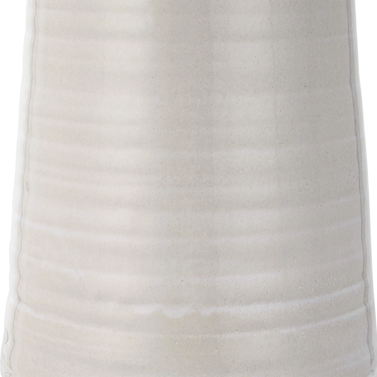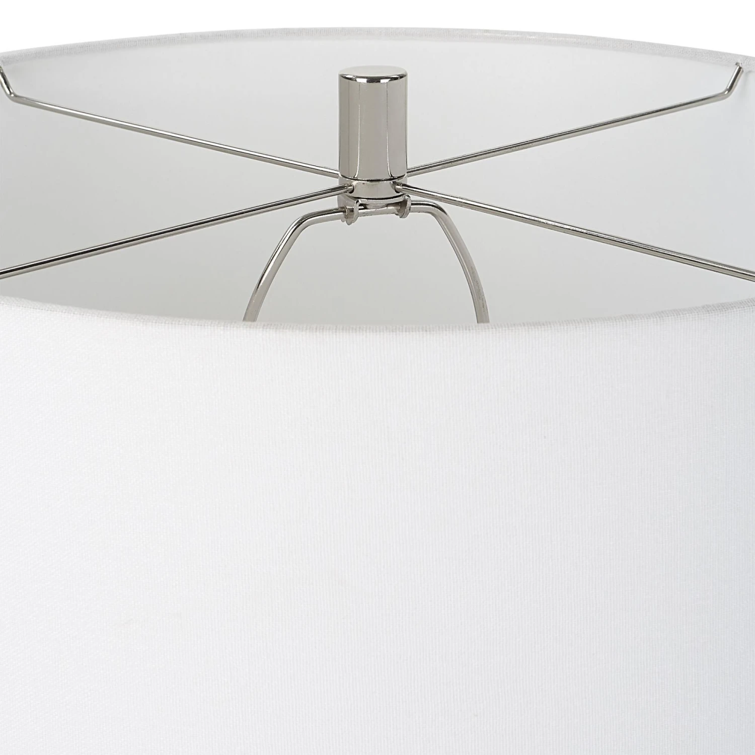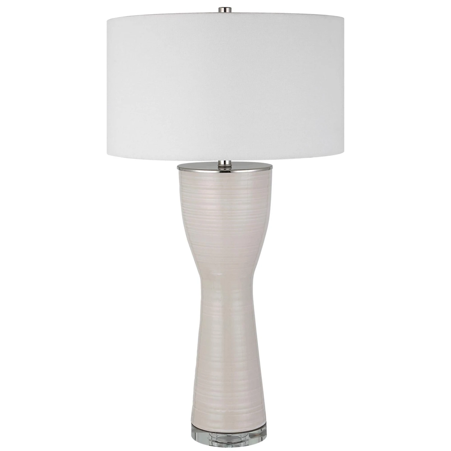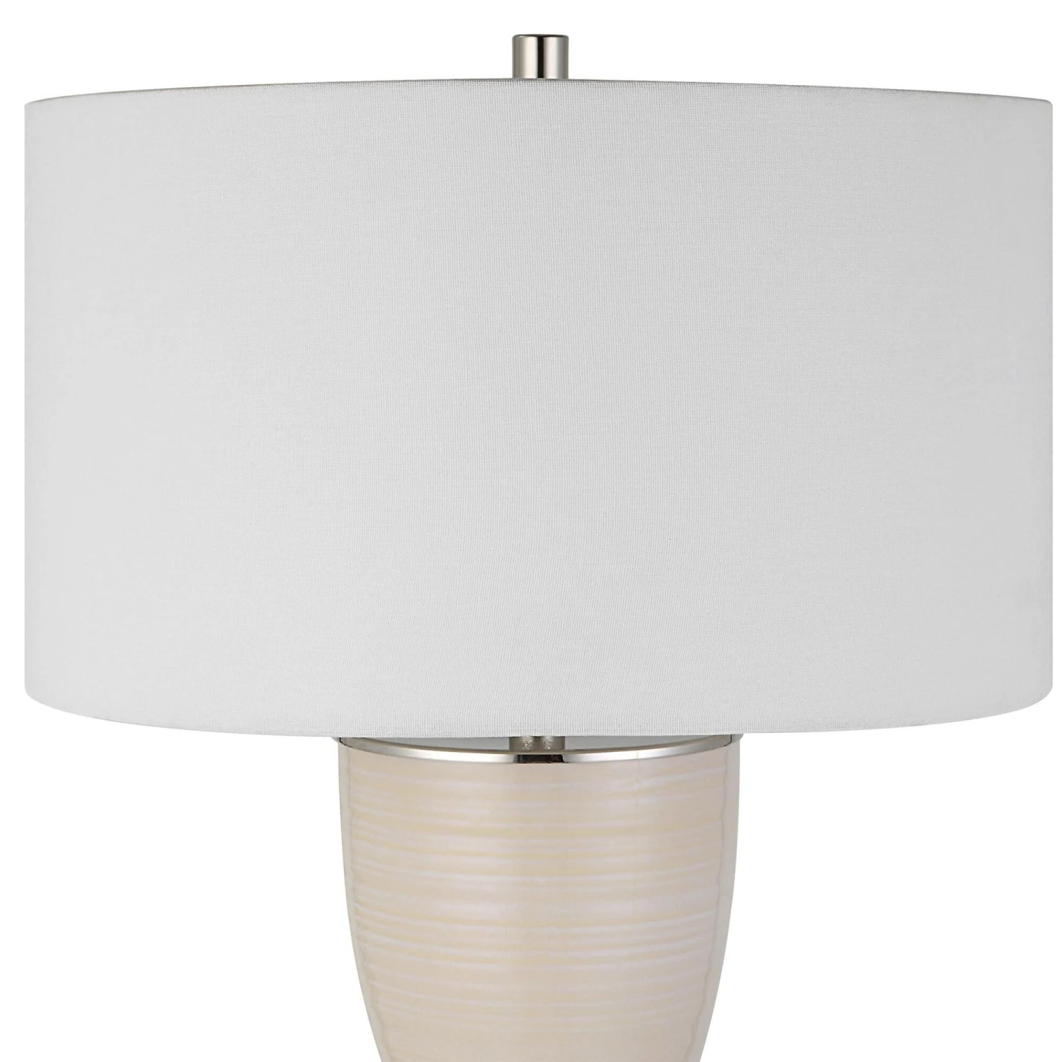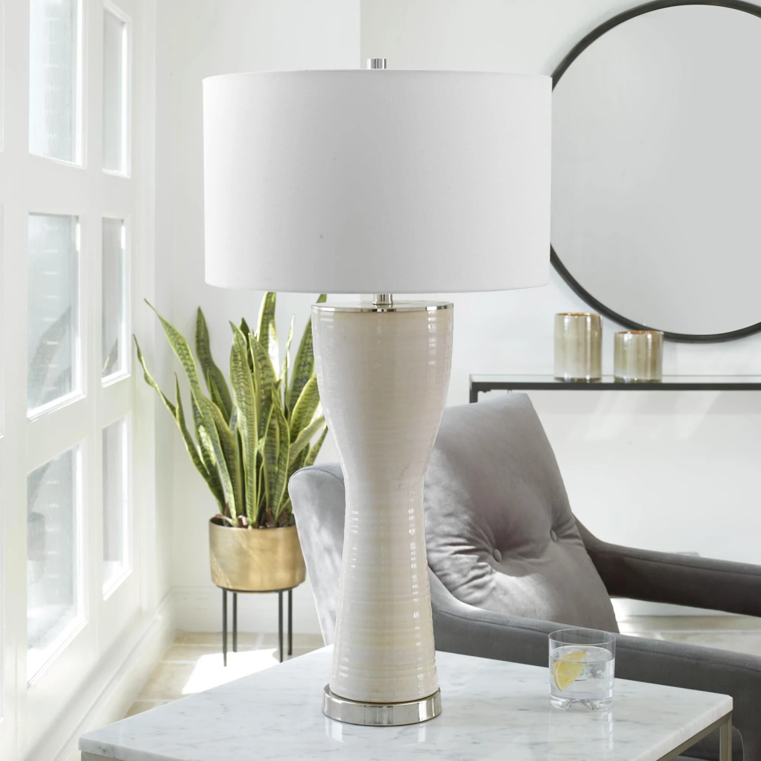 This Ceramic Table Lamp Displays An Elegant Curved Silhouette That Creates A Fresh Yet Traditional Feel. The Base Is Finished In An Off-white Crackle Glaze And Is Accented By Polished Nickel Plated Details. The Lamp Is Complimented By A White Fabric Drum Shade.