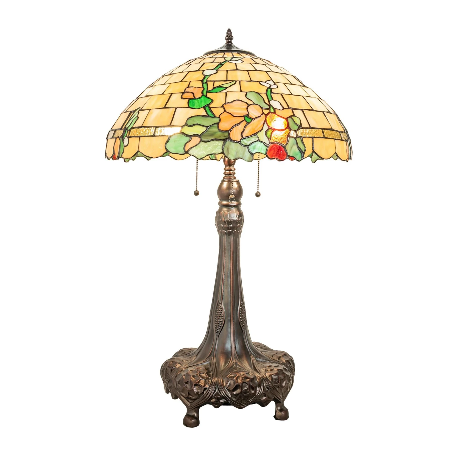 Symbolizing The Circle Of Life; Ambition And Fertility; Hollyhock Flowers Are Typically Planted Near The Front Door To Welcome In Prosperity And Good Luck To The Home. This Duffner & Kimberly Reproduction Table Lamp Features Flourishes Of Orange Hollyhocks Accented With Green Leaves On An Amber Gridwork Background. The Tiffany Style Handcrafted Shade Is Created Using The Famous Meyda Tiffany Copperfoil Construction Technique And Perched On A Hand Finished Lamp Base In Mahogany Bronze. The Duffner & Kimberly Hollyhock Table Lamp Is Featured In Our American Designed; Handmade Tiffany Stained Glass Lighting Collection. Ul And Cul Listed For Dry Locations.
