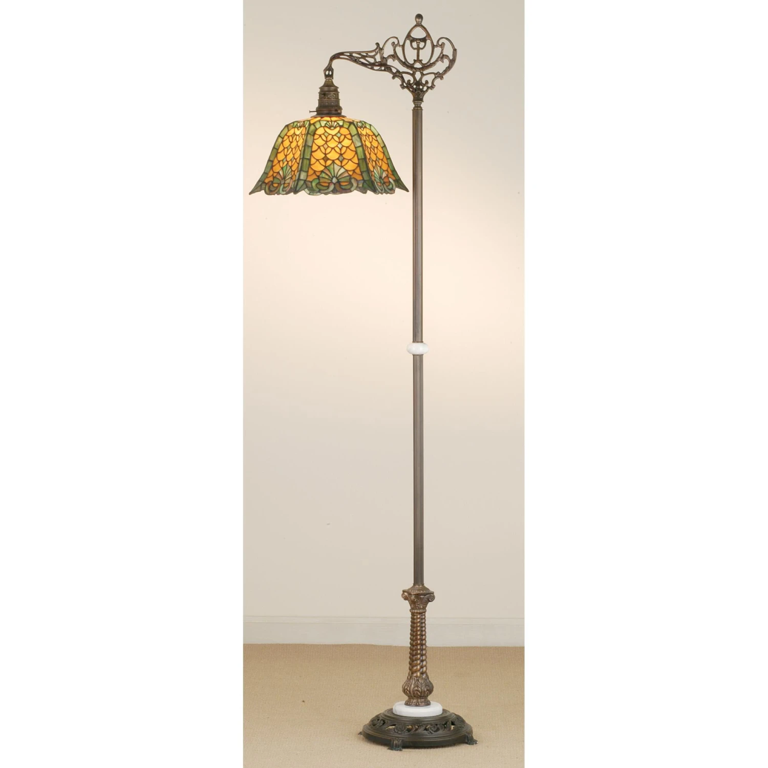 Duffner & Kimberly was a prolific studio specializing in copperfoil construction. This beautiful Stained glass shade in Honey Amber; with a beautifully executed Jade glass pattern; is inspired by European architecture. This Tiffany style shade is matched with a Mahogany Bronze finished floor lamp base that is accented with marble.