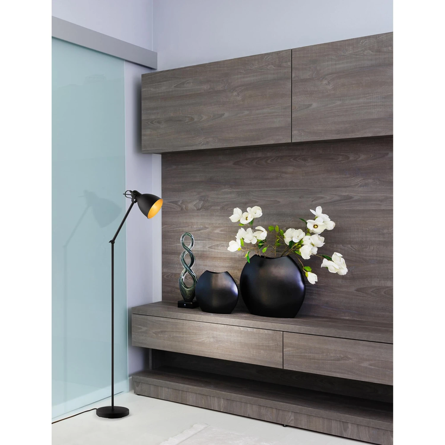 Eglo’s Priddy 2 Family is luxuriously modern in style. This 1-bulb floorlamp in black finish features a circular base, adjustable arm, and shade with gold interior.With its sleek design and style, the floor lamp will complement the interior decor of the roomwhile adding stylish lighting. Great for bedroom, office, living room, game room, etc.