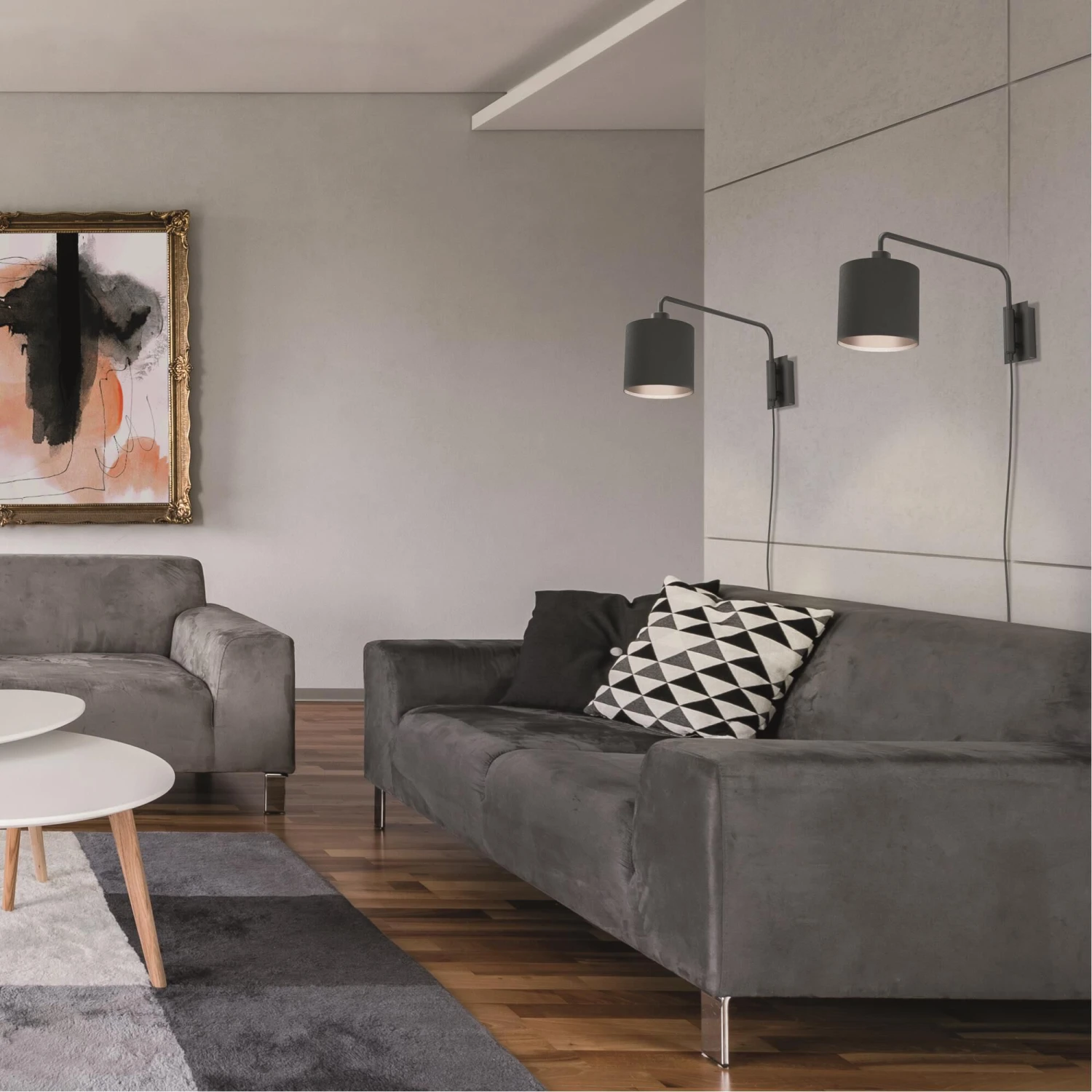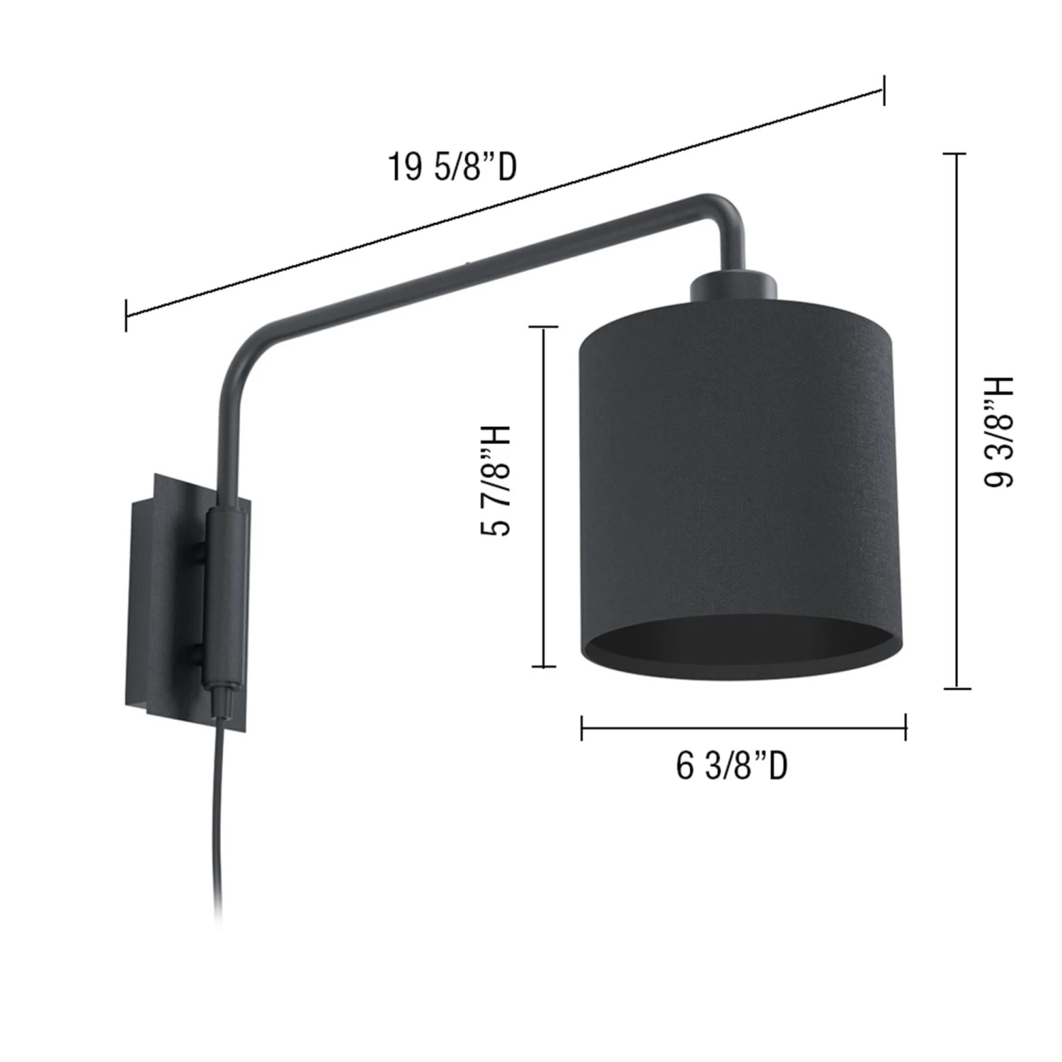 The Salti 1 wall sconce by Eglo features a classic gooseneck design with a black finish and black drum shaped fabric shade. The two in one design of this wall sconce allows you to install it as a plug in so you can move it easily or hardwire in place for a long lasting look.