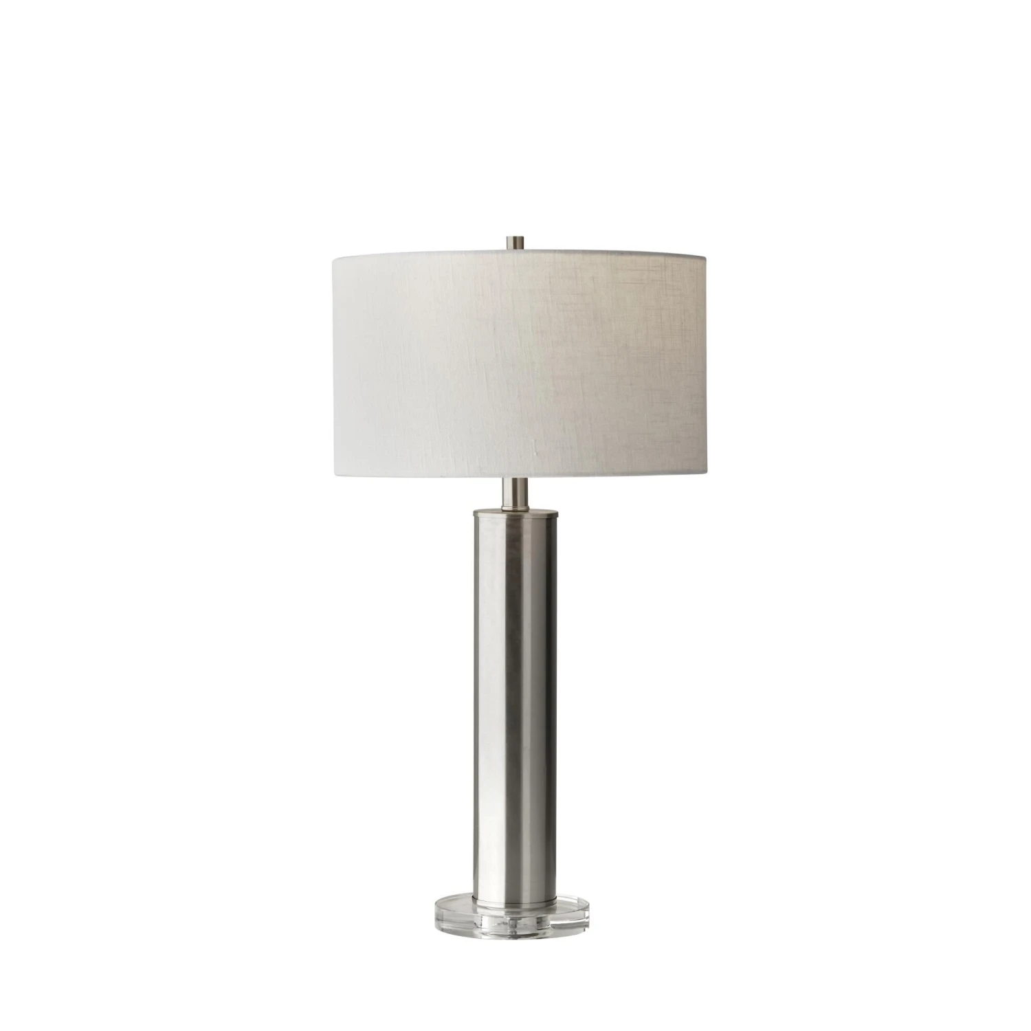 A stately addition to the bedroom or living room, the Ezra Table Lamp has a thick black metal pole connected to a beautiful crystal base. The dark grey woven fabric shade has the smallest tint of green to it, adding the perfect amount of pop to this contemporary look. A simple on/off switch is located on the socket. With a 25.5″ height, a 3.25″ thick pole and a 14″ round shade, this lamp is solid and sturdy with a modern design.