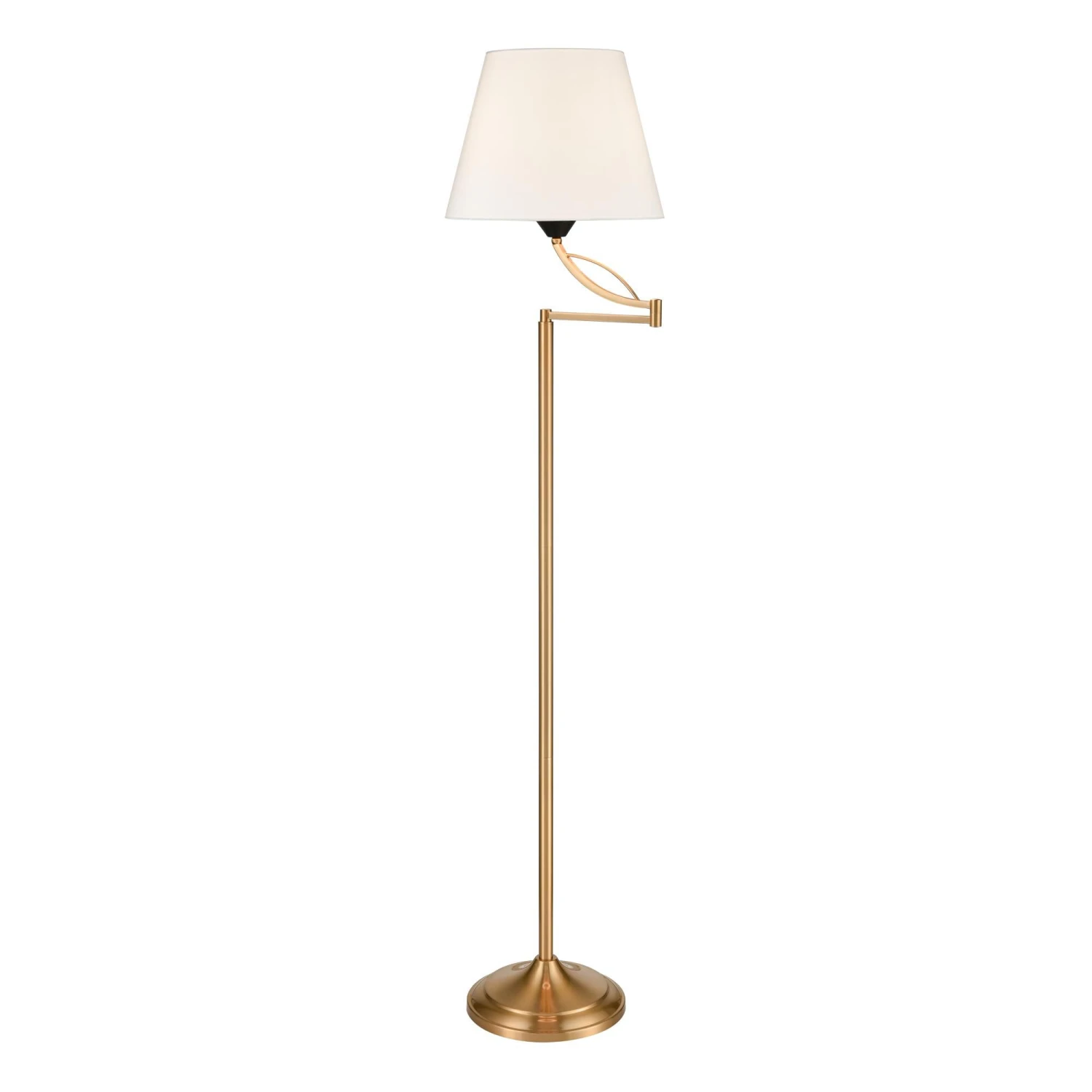 The Fluency Floor Lamp holds a single bulb on an articulated arm, allowing its glow to be positioned and directed. This slim, elegant design is made from metal in a two-tone aged brass and black finish. Ideal for an updated traditional style living room or bed room, this piece offers chic, timeless appeal and is topped with a round, hardback shade in white faux silk.