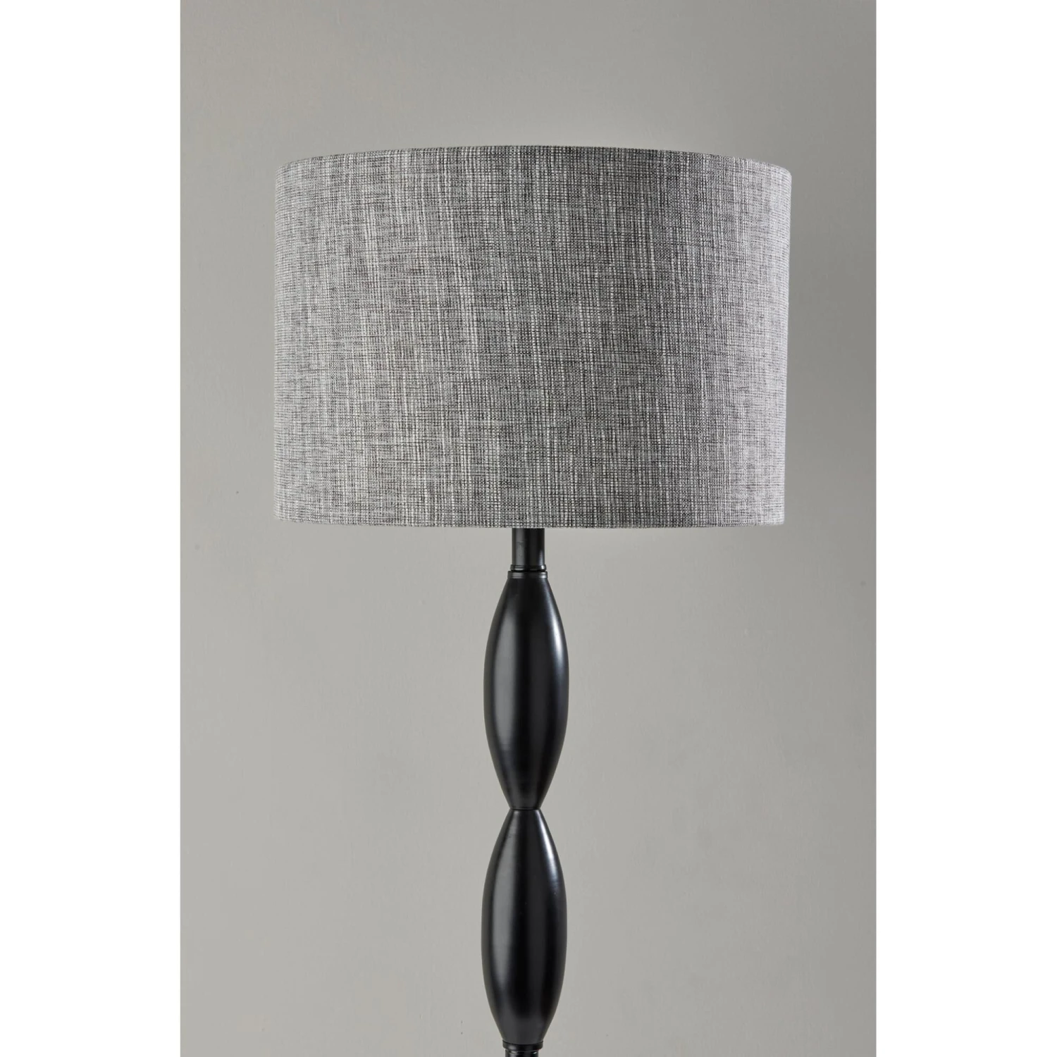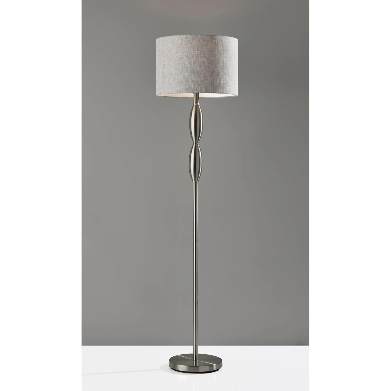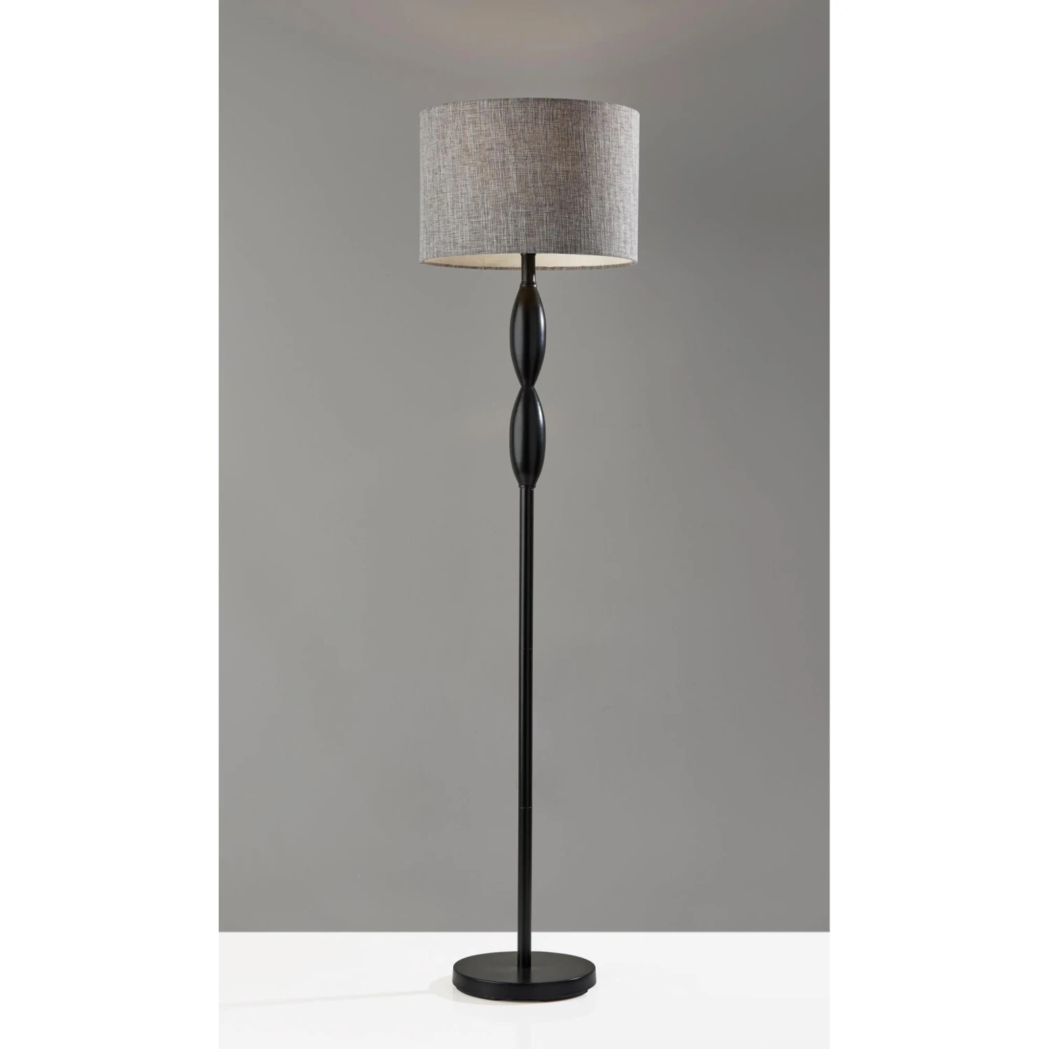 The classic candlestick shape is given a contemporary spin in the design of the Lance floor lamp. The 60.5 tall lamp features a black metal finish on the stem and matching round base, which is perfectly complemented by the dark grey and white textured shade for a distinctive, contemporary look. The short drum shade is 10 high and 15 in diameter and softly distills light from a 100W bulb (not included). Operated by a rotary socket switch to easily turn it on or off, the Lance floor lamp also includes a 6′ black cord. This lamp is also available in a brushed steel finish for a lighter look.