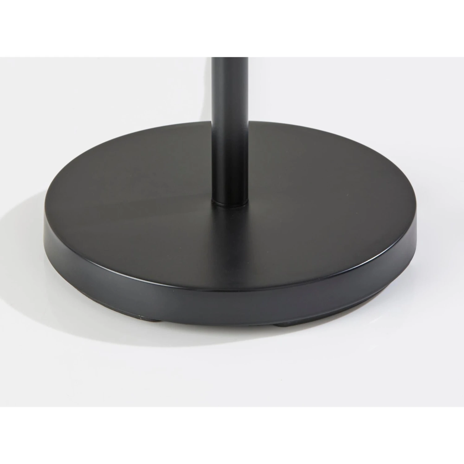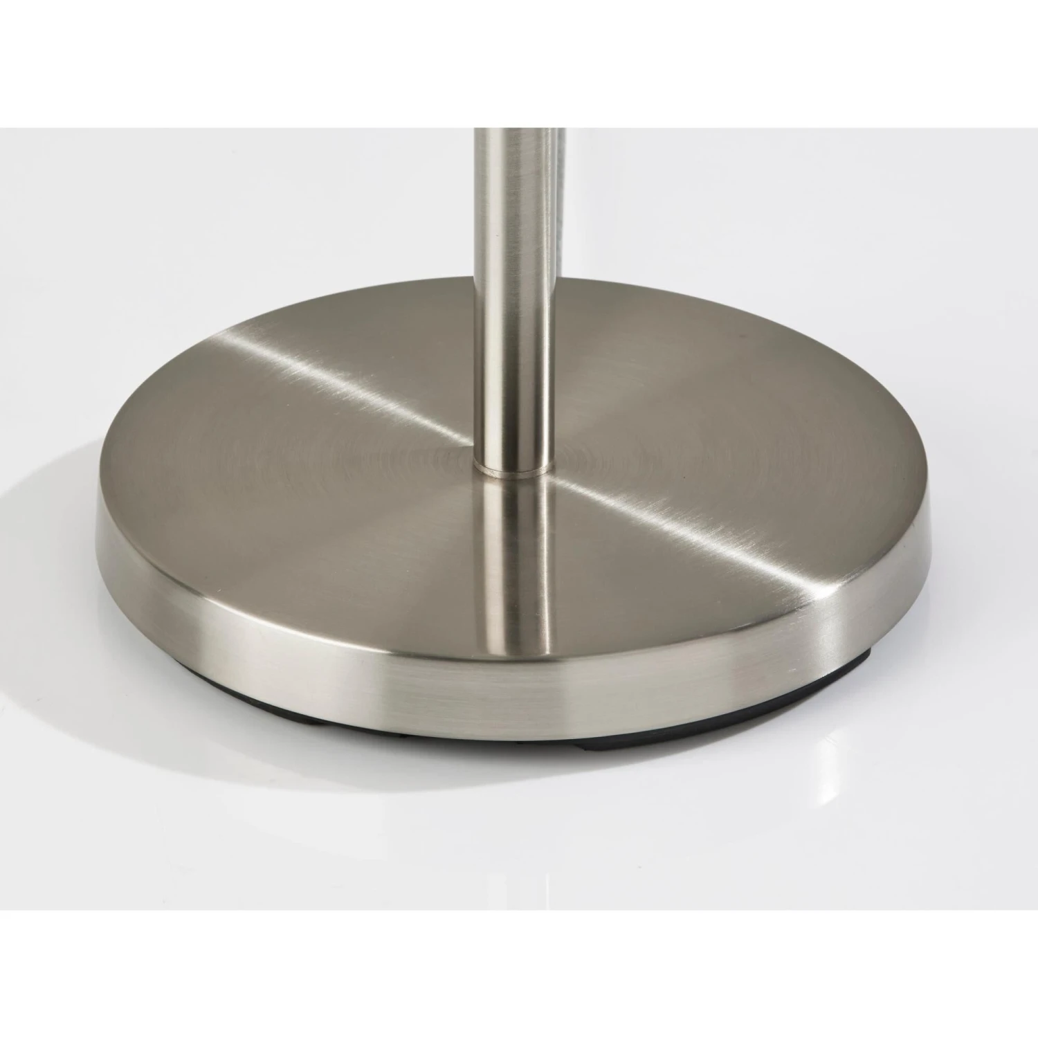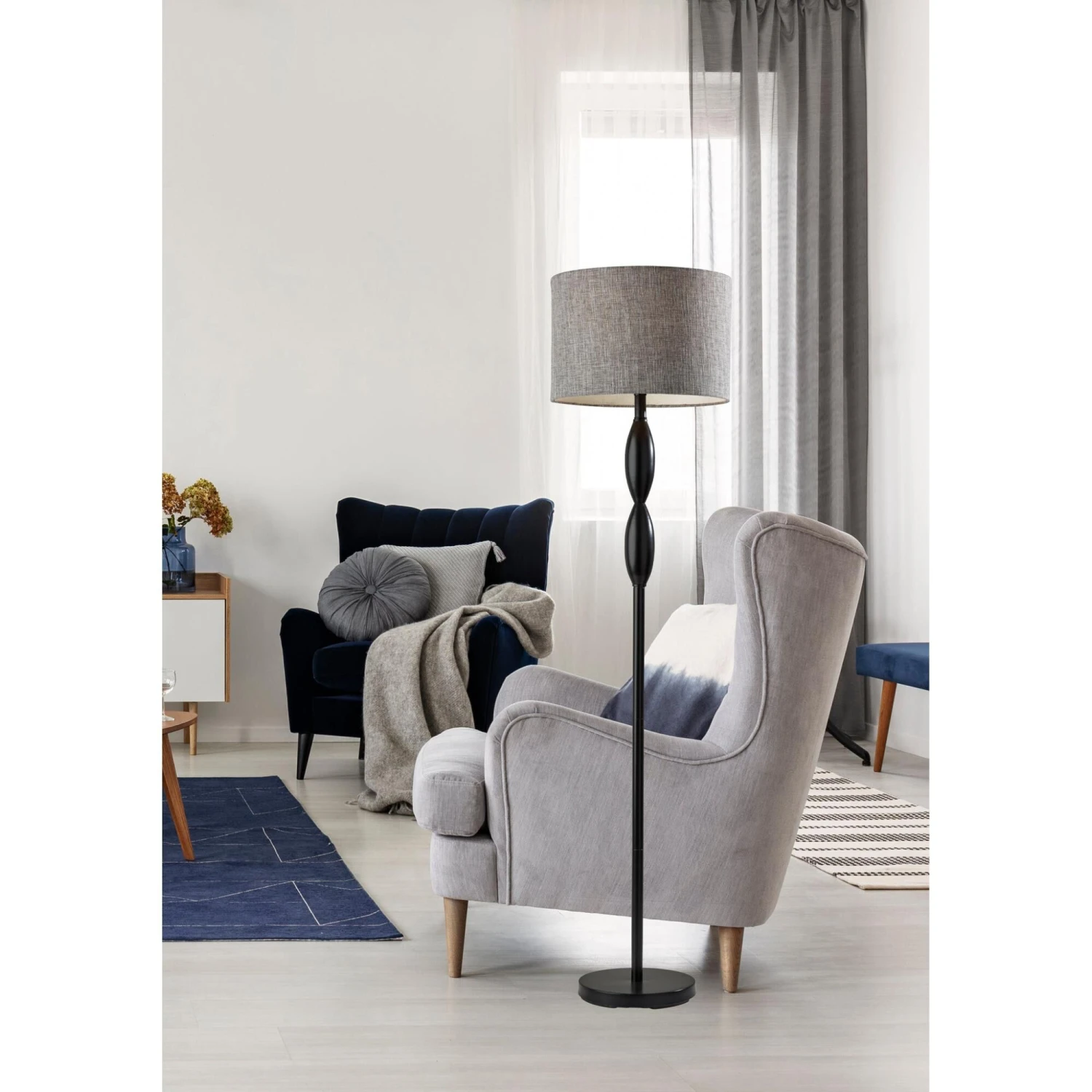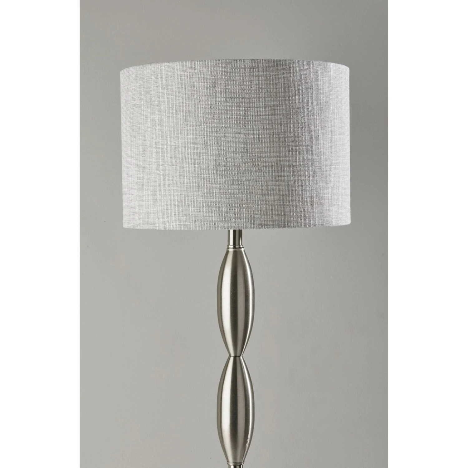 The classic candlestick shape is given a contemporary spin in the design of the Lance floor lamp. The 60.5 tall lamp features a black metal finish on the stem and matching round base, which is perfectly complemented by the dark grey and white textured shade for a distinctive, contemporary look. The short drum shade is 10 high and 15 in diameter and softly distills light from a 100W bulb (not included). Operated by a rotary socket switch to easily turn it on or off, the Lance floor lamp also includes a 6′ black cord. This lamp is also available in a brushed steel finish for a lighter look.