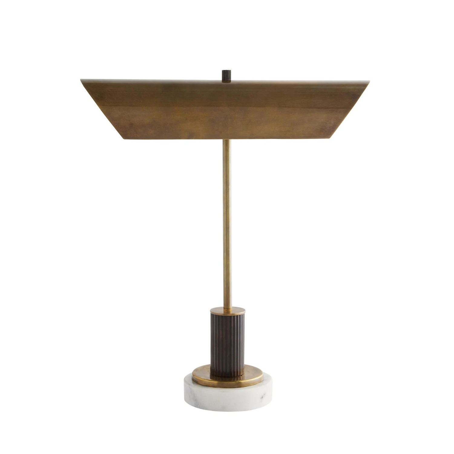 The iconic style of the classic library lamp is beautifully translated in the design of the Lansing. The elongated vintage brass metal shade is perched atop a bronze finished aluminum post, with a white marble base for a dramatic transition of tones and textures. A juxtaposition of materials and shapes is revealed through the linear shade, circular base, and the reeding details found on the finial and body. This lamp features two sockets for increased surface illumination. Finish will vary.