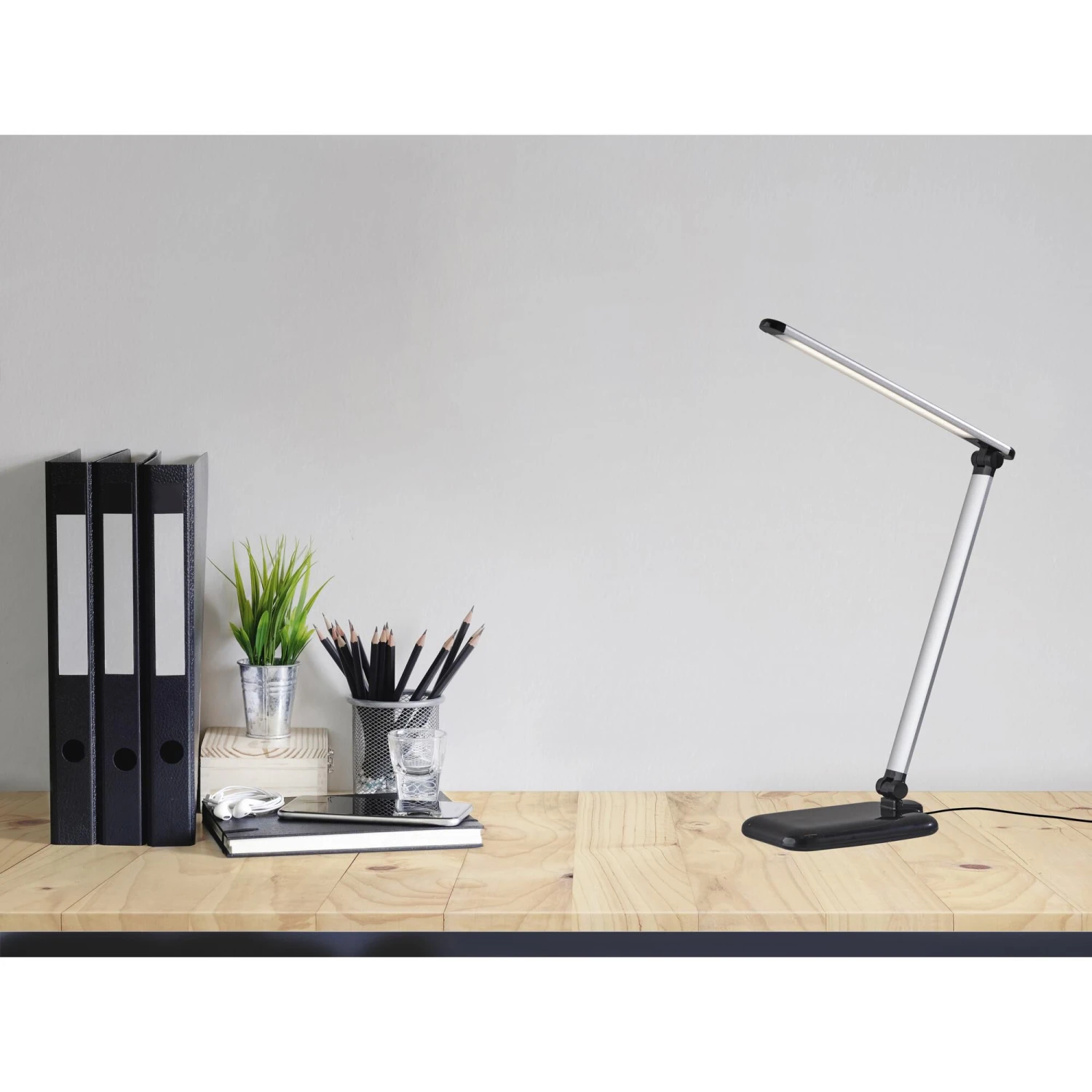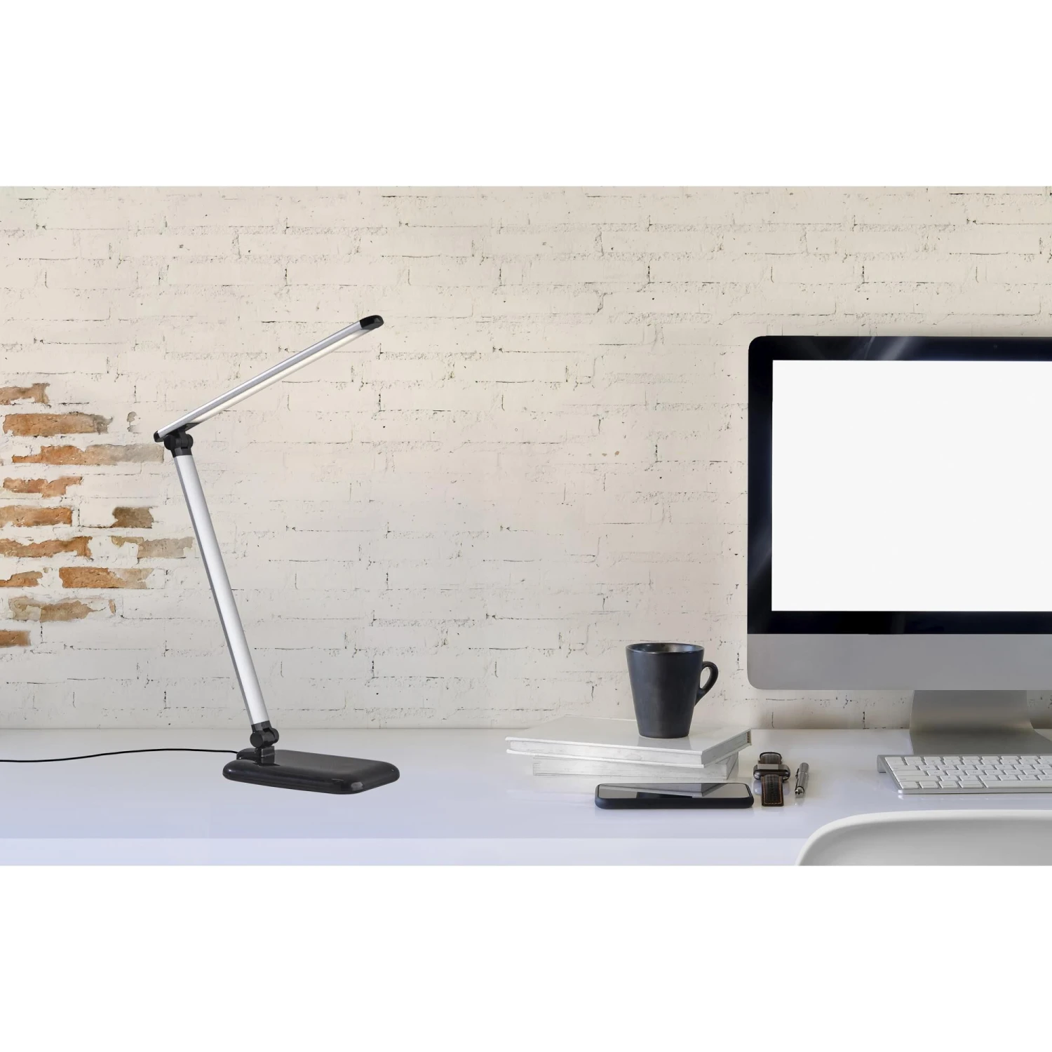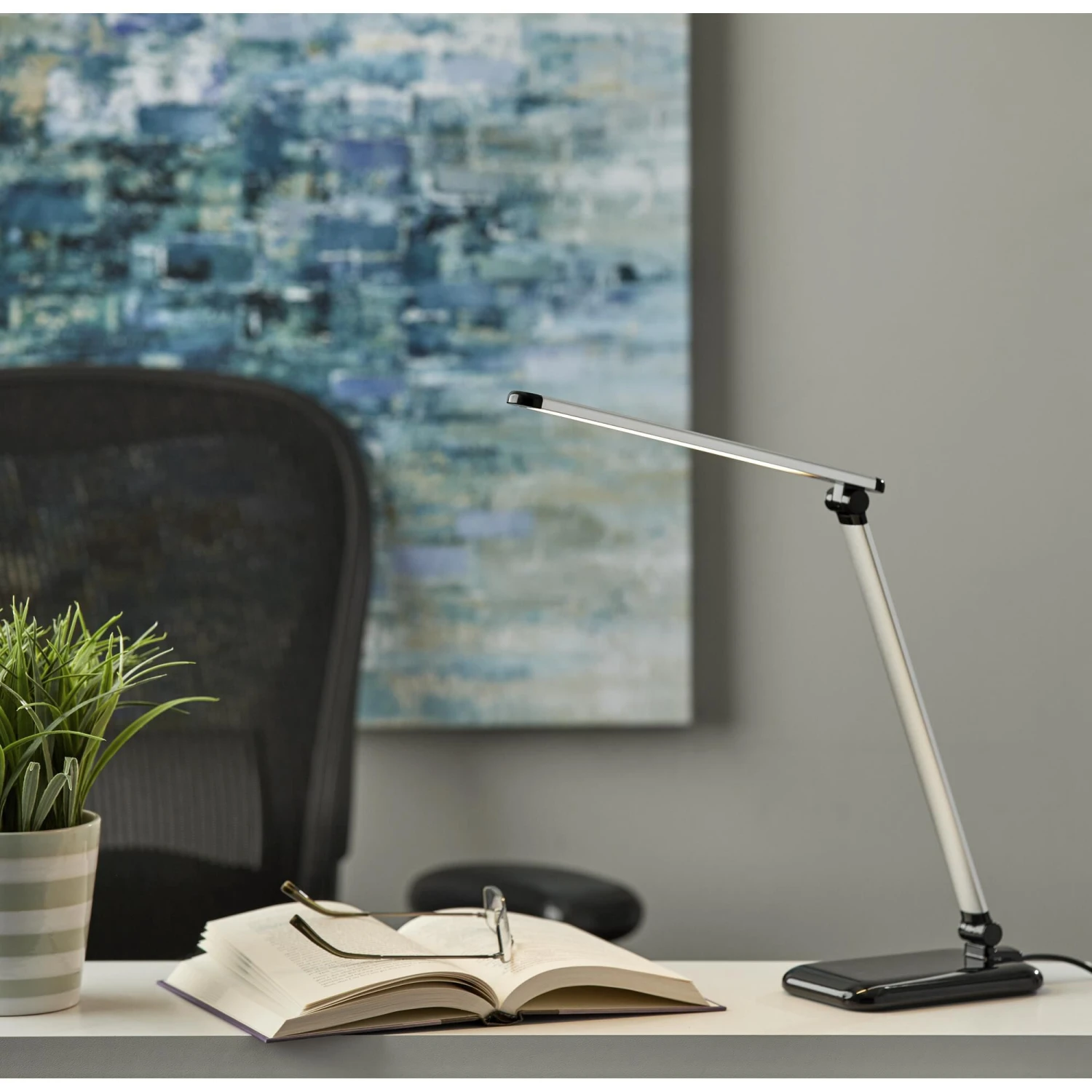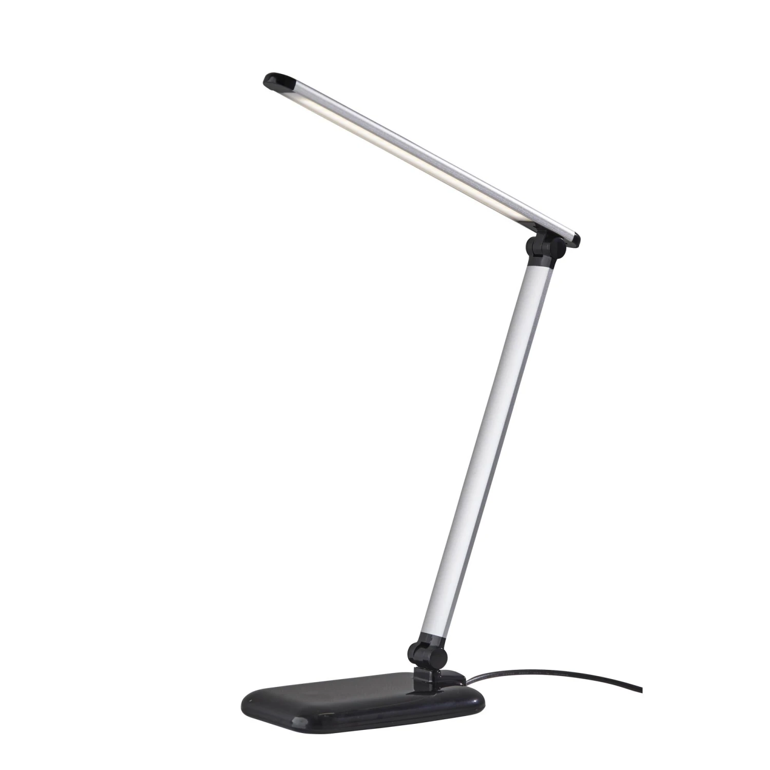 This high powered, high-tech, modern desk lamp is the perfect solution to any workspace. Complete control of the light intensity and color allows you to customize the light to your needs at any time of the day. Whether you are working, reading or relaxing, the 5 light color temperature modes provide you with various options to suit your environment and mood. Adjust the light intensity with a simple touch dimmer switch offering 5 different brightness options. A convenient USB charging port located in the base lets you charge up your devices while you work. An adjustable arm with joints at the base and mid-point allows for 400 lumens of flicker free, energy efficient LED light to reach any area of the workspace. A sleek, modern silhouette finished in silver and black offers added sophistication. The LEDs are integrated into this lamp and are not replaceable. However, Adesso LEDs are top quality and last around 50,000 hours!