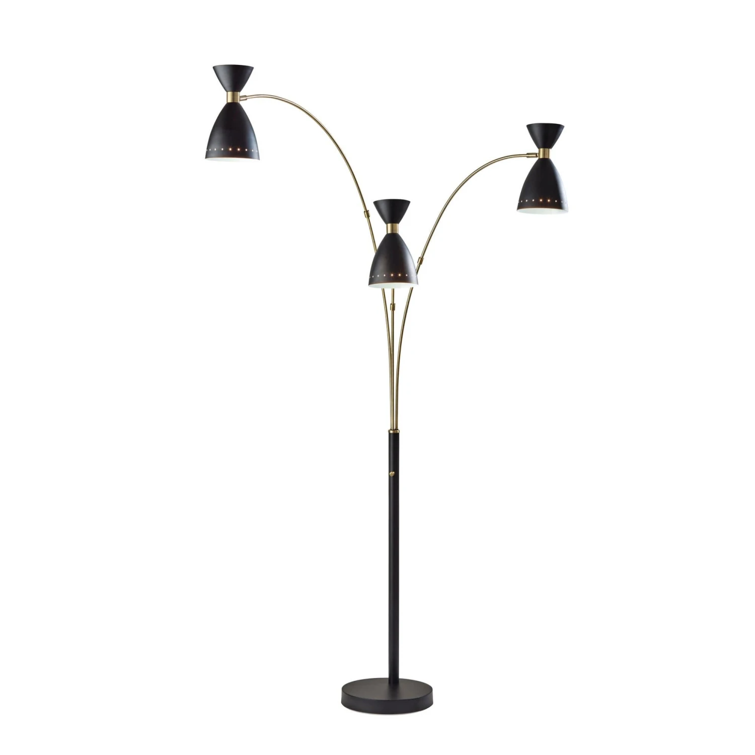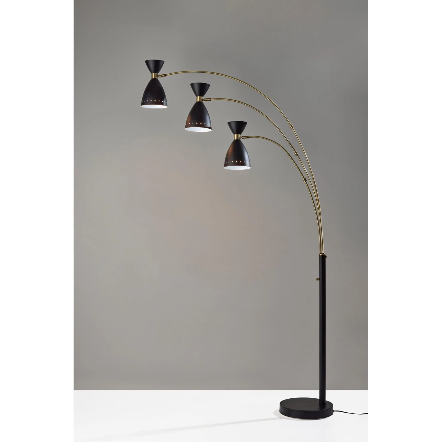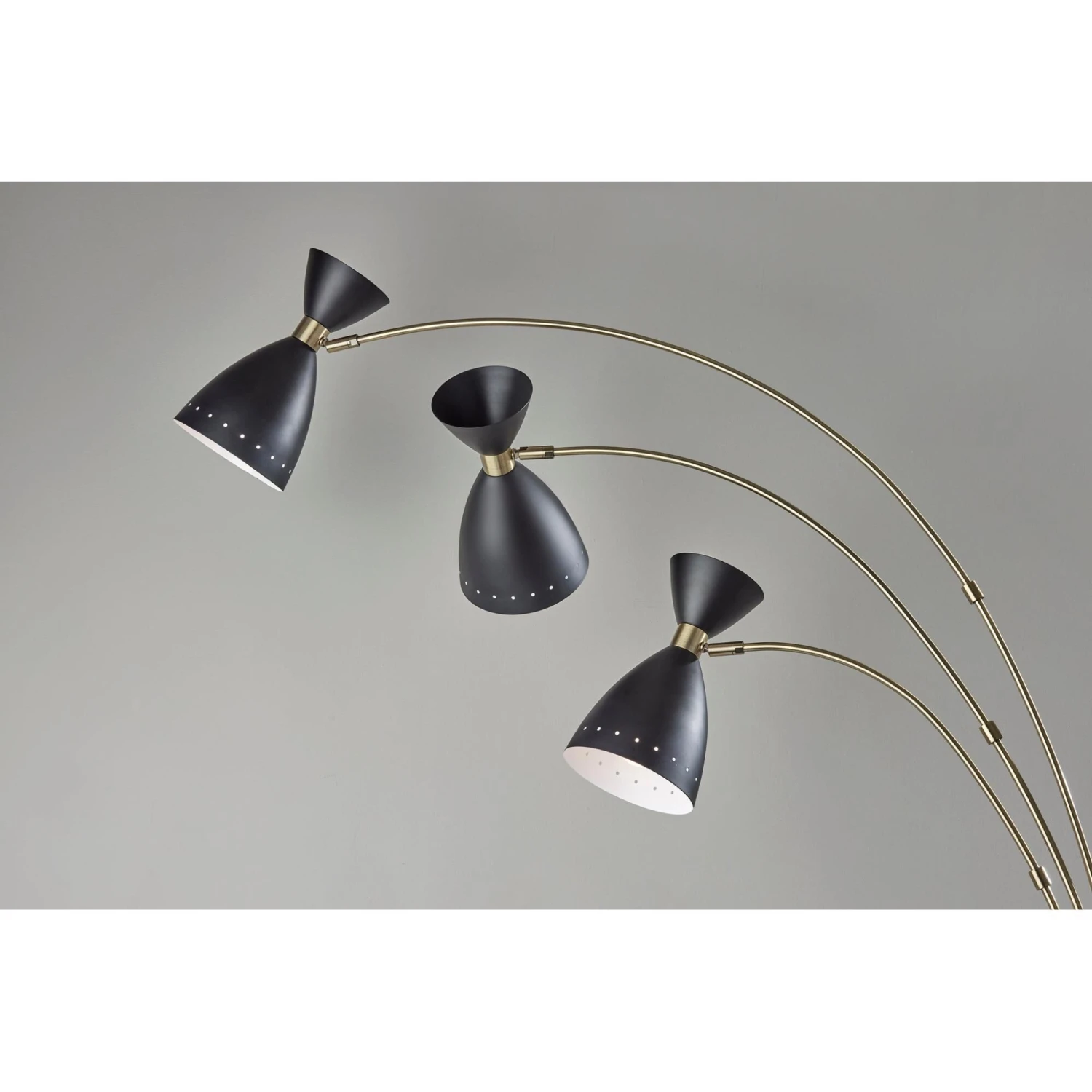 Bring a modern touch to your dcor with the clean styling of the Oscar 3-arm arc floor lamp. The arcing design and slender profile of this 82? tall lamp makes it the perfect addition in room corners or beside furniture. The round black painted metal base provides stability, and the black finish continues through the pole leading to three long and slender antique brass arcing arms. Each arm is topped by a 40W bulb (not included) and a contemporary black metal bell-shaped shade with antique brass accents. The three arms can be swiveled and repositioned from the base, and each head features an adjustable joint, allowing you to direct the light wherever its needed. Operated by a rotary switch located on the pole, this lamp features multiple lighting settings. A simple twist of the switch turns one lightbulb on, another twist turns two of the lightbulbs on, a third twist illuminates all three of the lights, and a fourth twist turns all lights off. The Oscar 3-arm arc lamp is also available in a white metal finish.