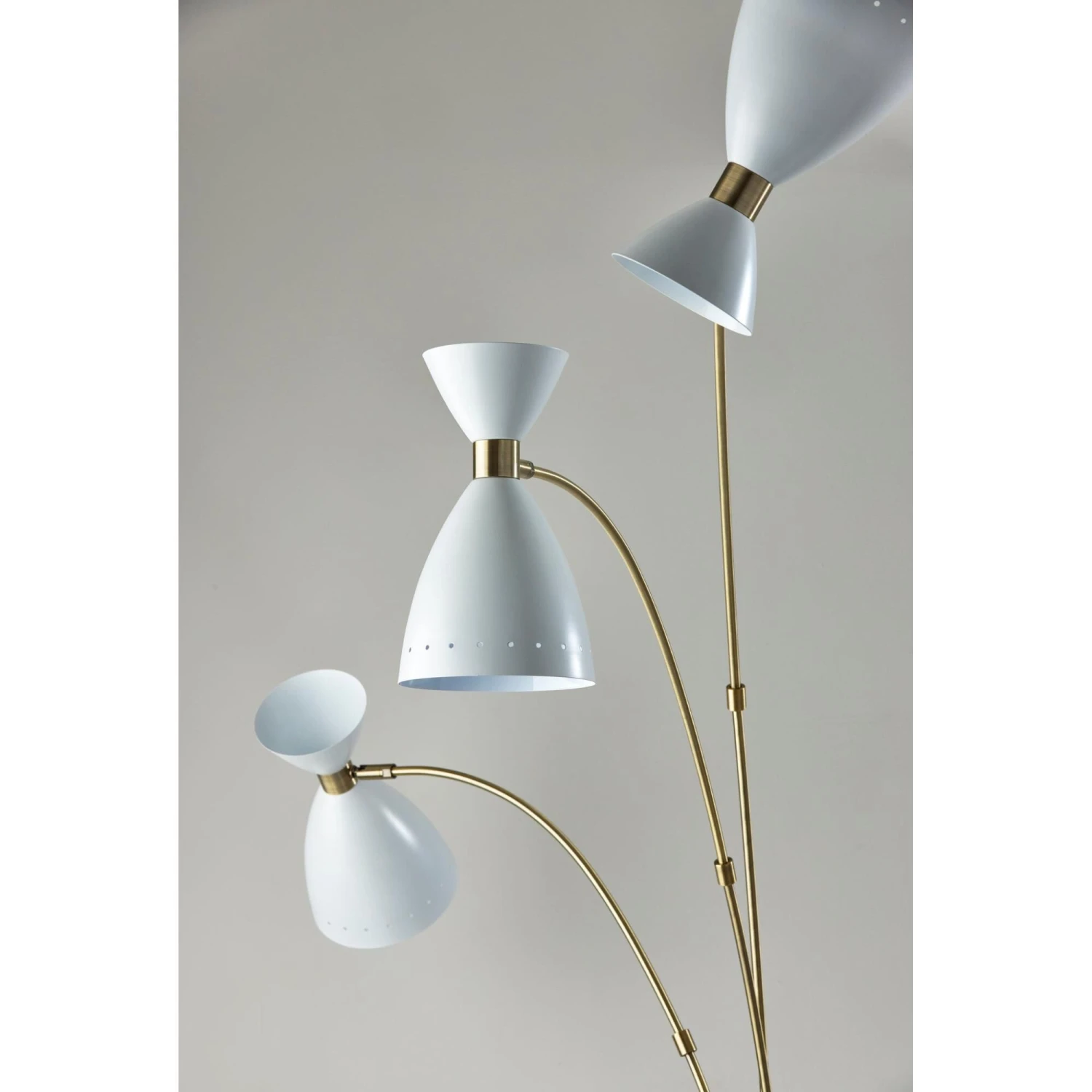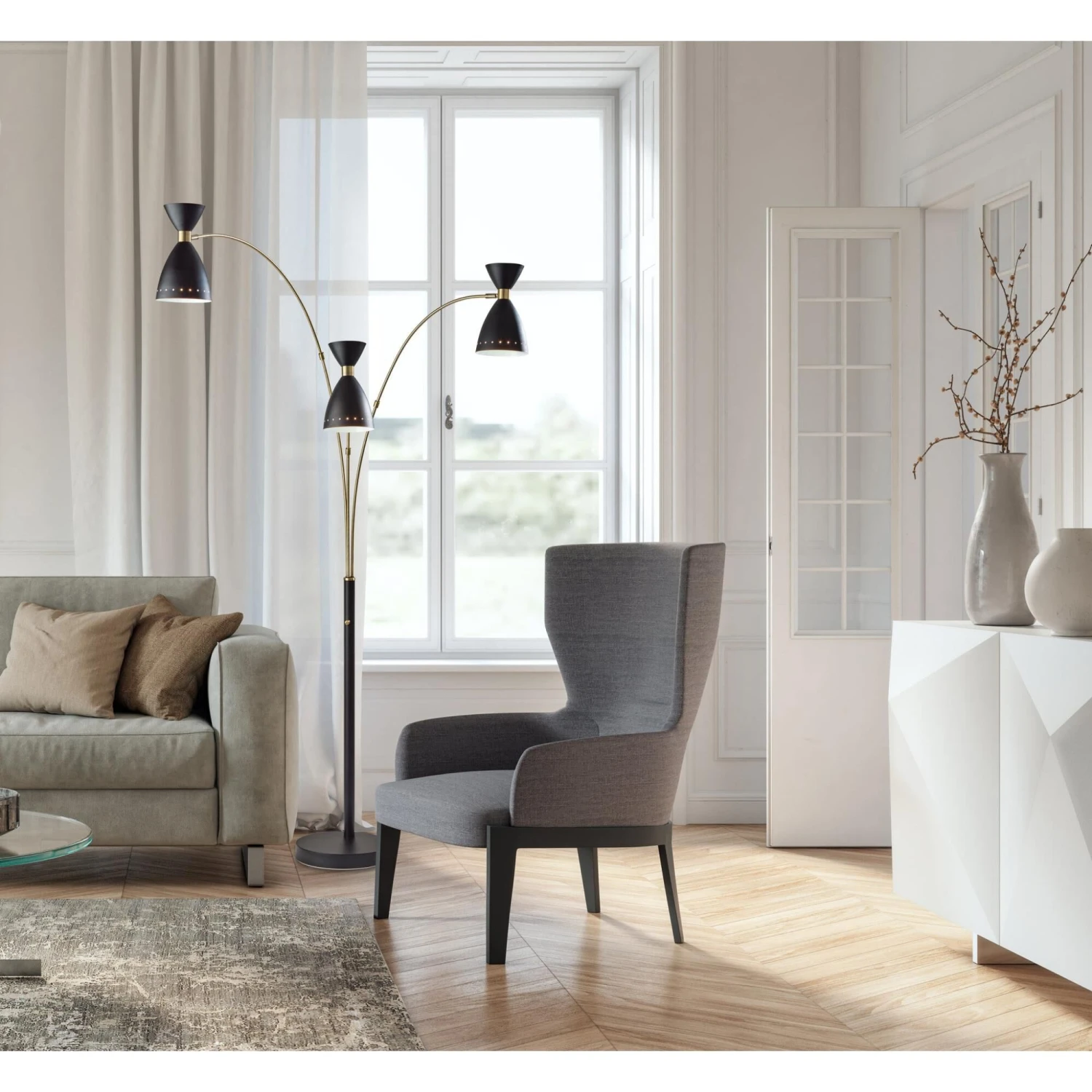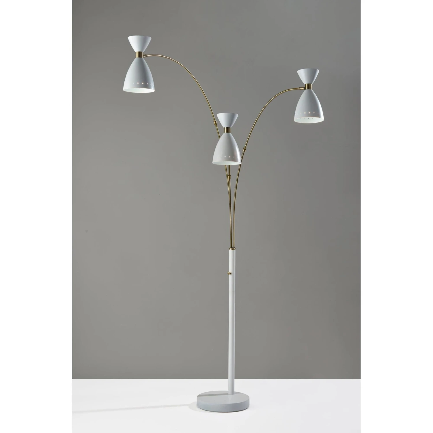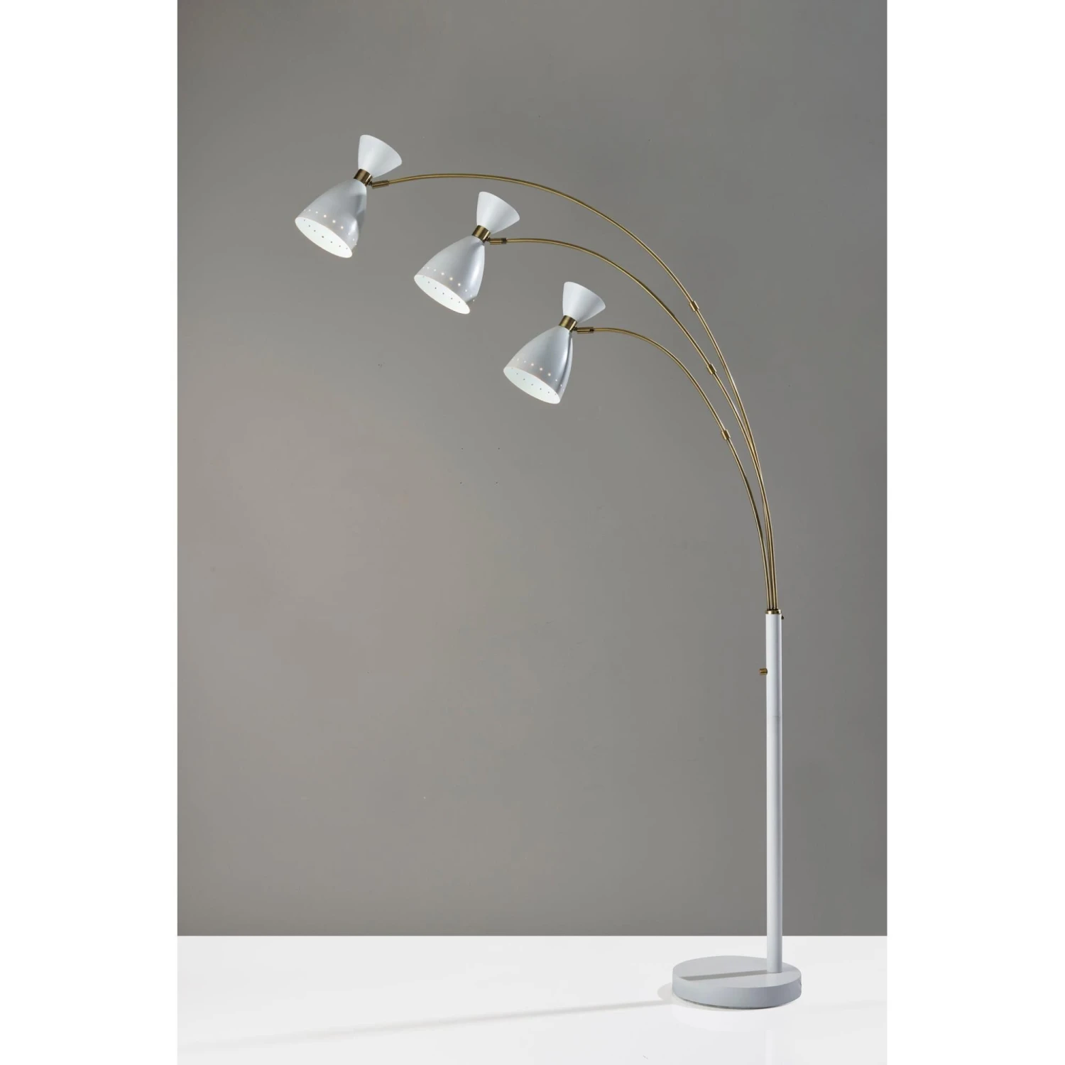Bring a modern touch to your dcor with the clean styling of the Oscar 3-arm arc floor lamp. The arcing design and slender profile of this 82? tall lamp makes it the perfect addition in room corners or beside furniture. The round black painted metal base provides stability, and the black finish continues through the pole leading to three long and slender antique brass arcing arms. Each arm is topped by a 40W bulb (not included) and a contemporary black metal bell-shaped shade with antique brass accents. The three arms can be swiveled and repositioned from the base, and each head features an adjustable joint, allowing you to direct the light wherever its needed. Operated by a rotary switch located on the pole, this lamp features multiple lighting settings. A simple twist of the switch turns one lightbulb on, another twist turns two of the lightbulbs on, a third twist illuminates all three of the lights, and a fourth twist turns all lights off. The Oscar 3-arm arc lamp is also available in a white metal finish.