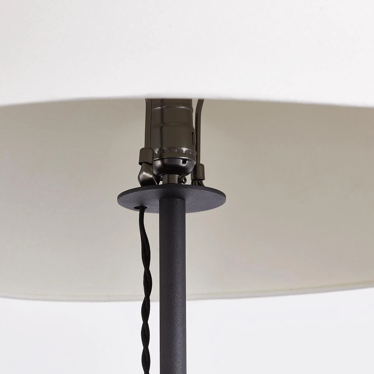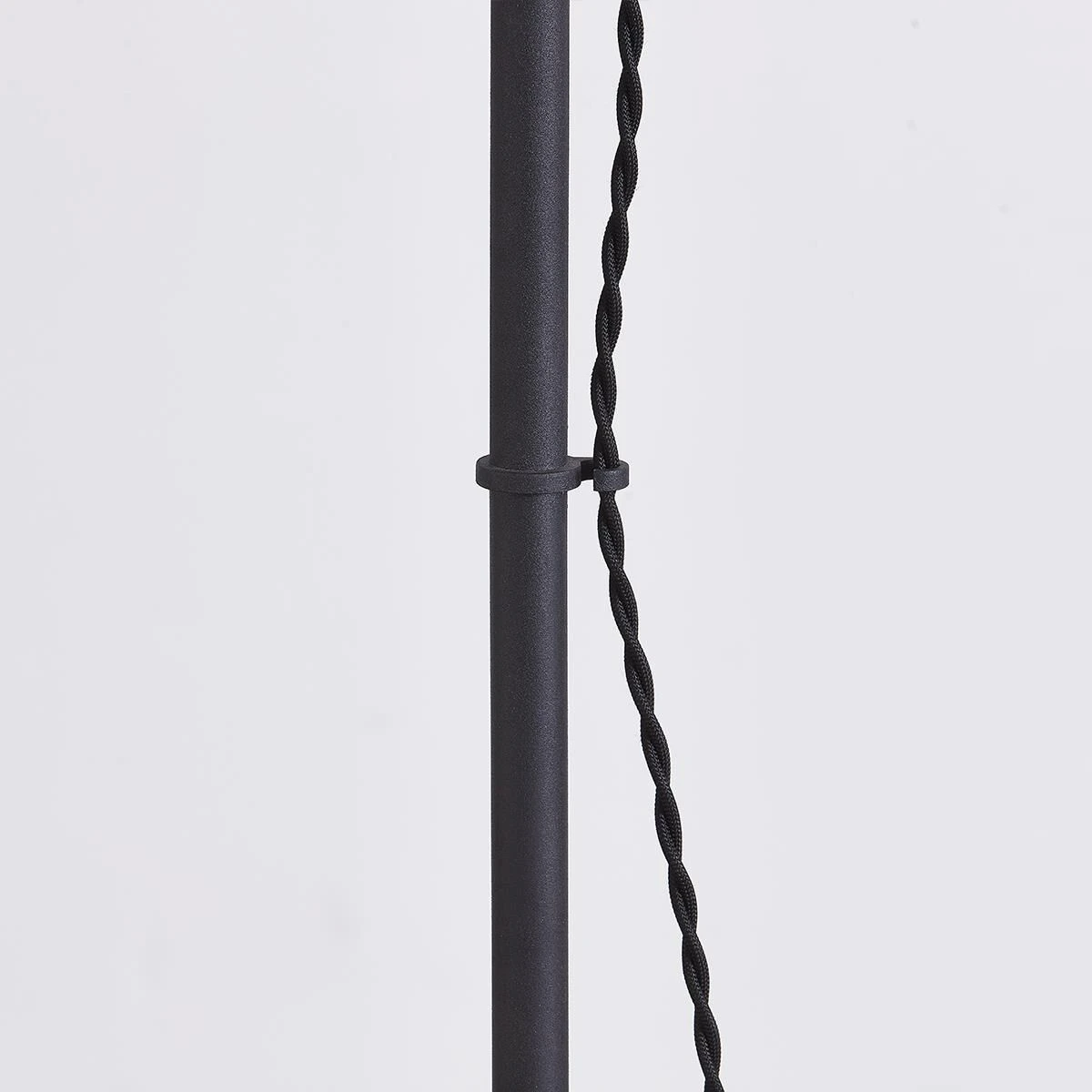 A braided cord threaded through a delicate hook elevates Pilar’s familiar tapered shade and slim pole design. The Textured Black finish and off-white linen shade make this floor lamp effortlessly usable in a variety of interiors.