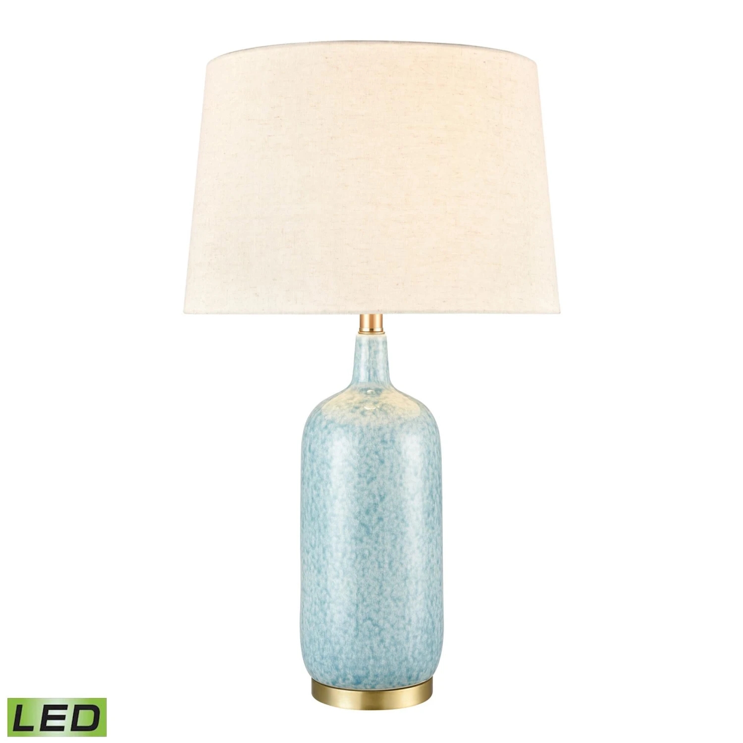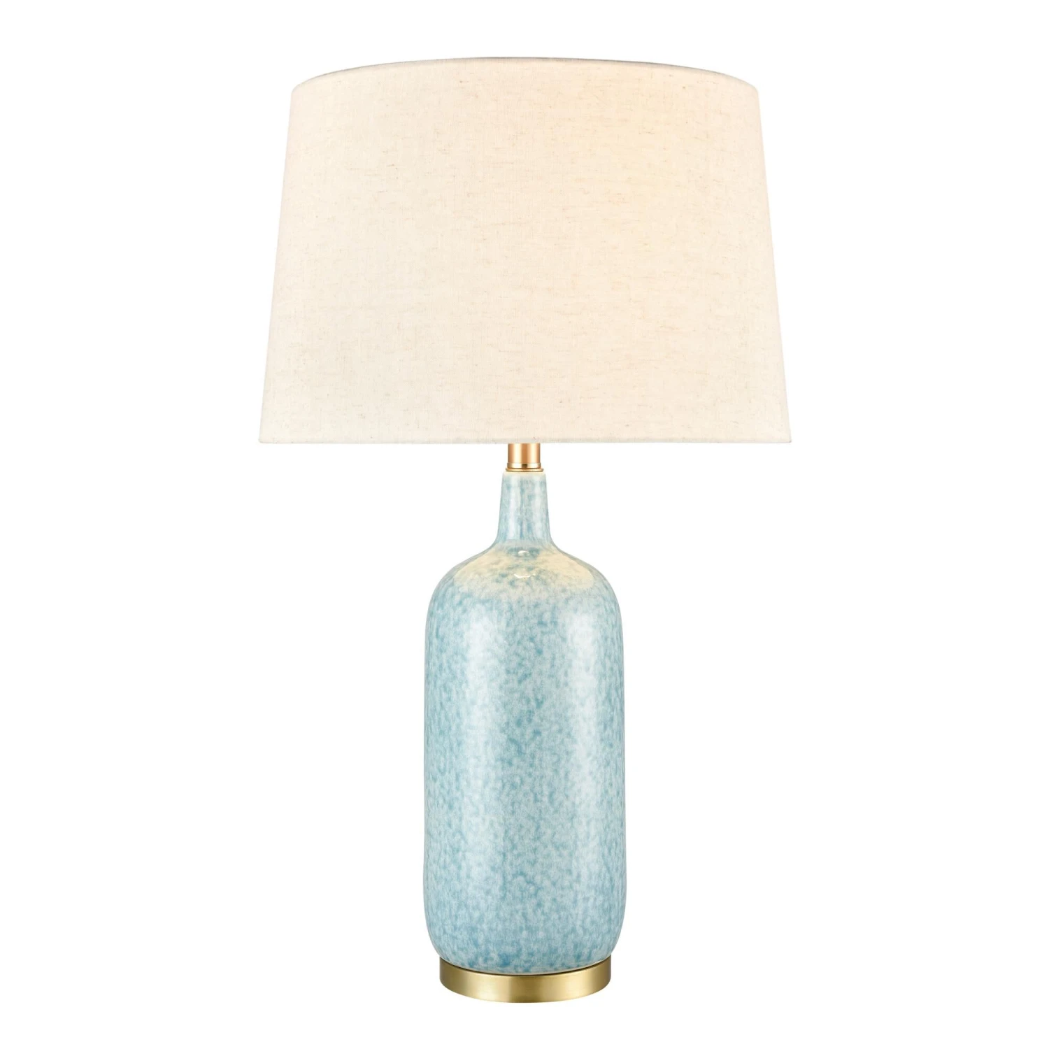The Port Isabel Table Lamp is made from earthenware in a sumptuous blue glaze finish that is perfectly complimented by its aged brass-finished appointments. This bottle shaped design is ideal for adding a pop of color to a coastal inspired bedroom or living room. Its round, hardback shade in sand linen adds a warm, natural tone to its look.