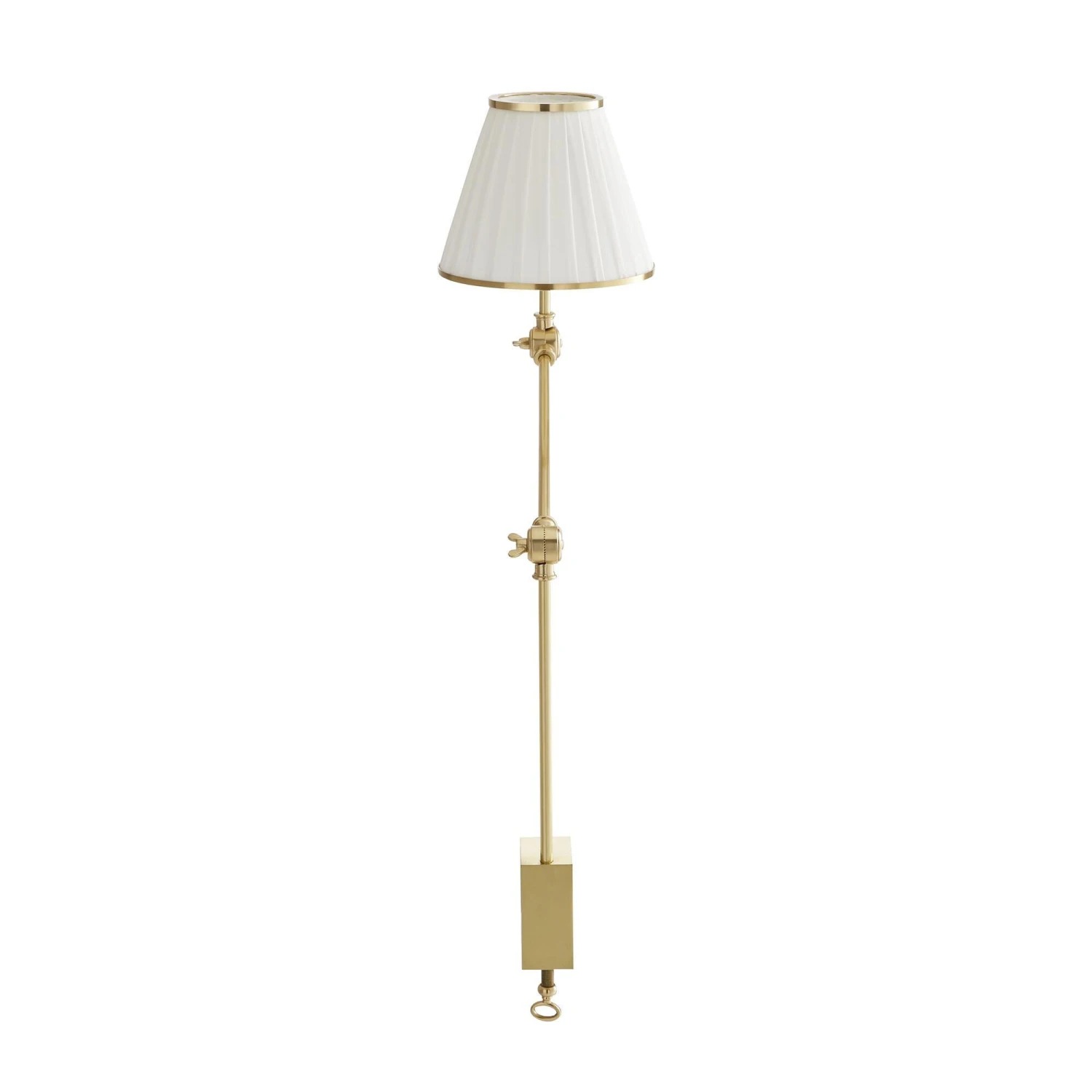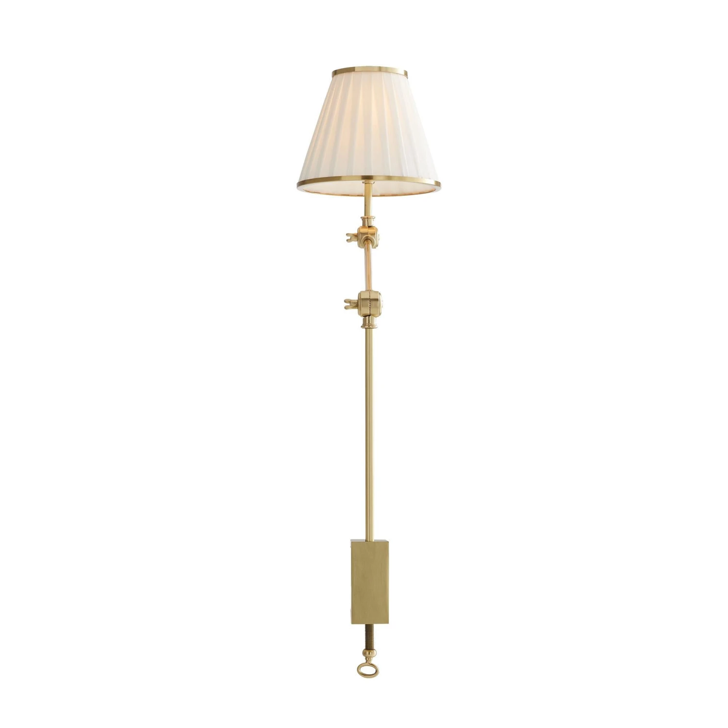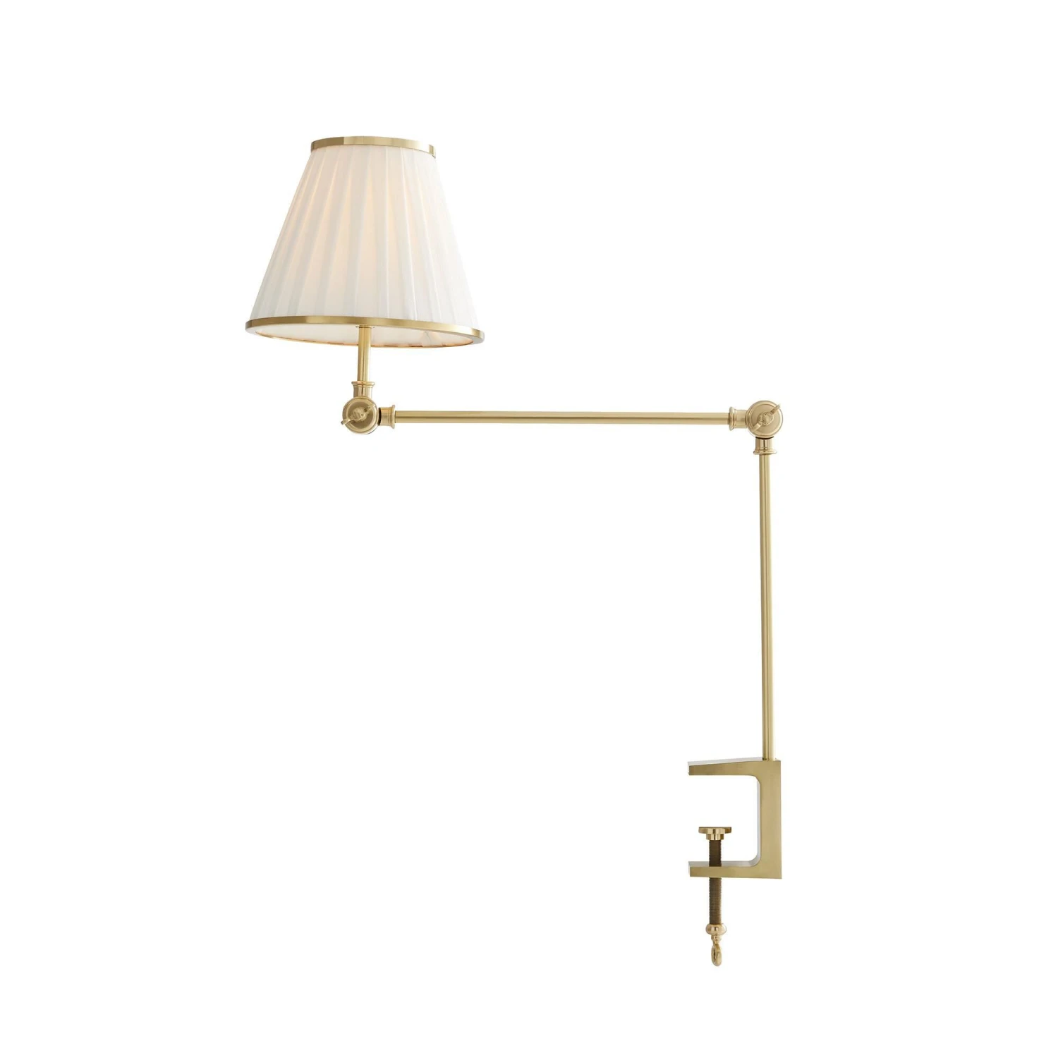 A slender task lamp thatclamps to the side of a table. The steel antique brass arm articulates in two locations, allowing the pleated white linen shade to tilt and adjust as needed.