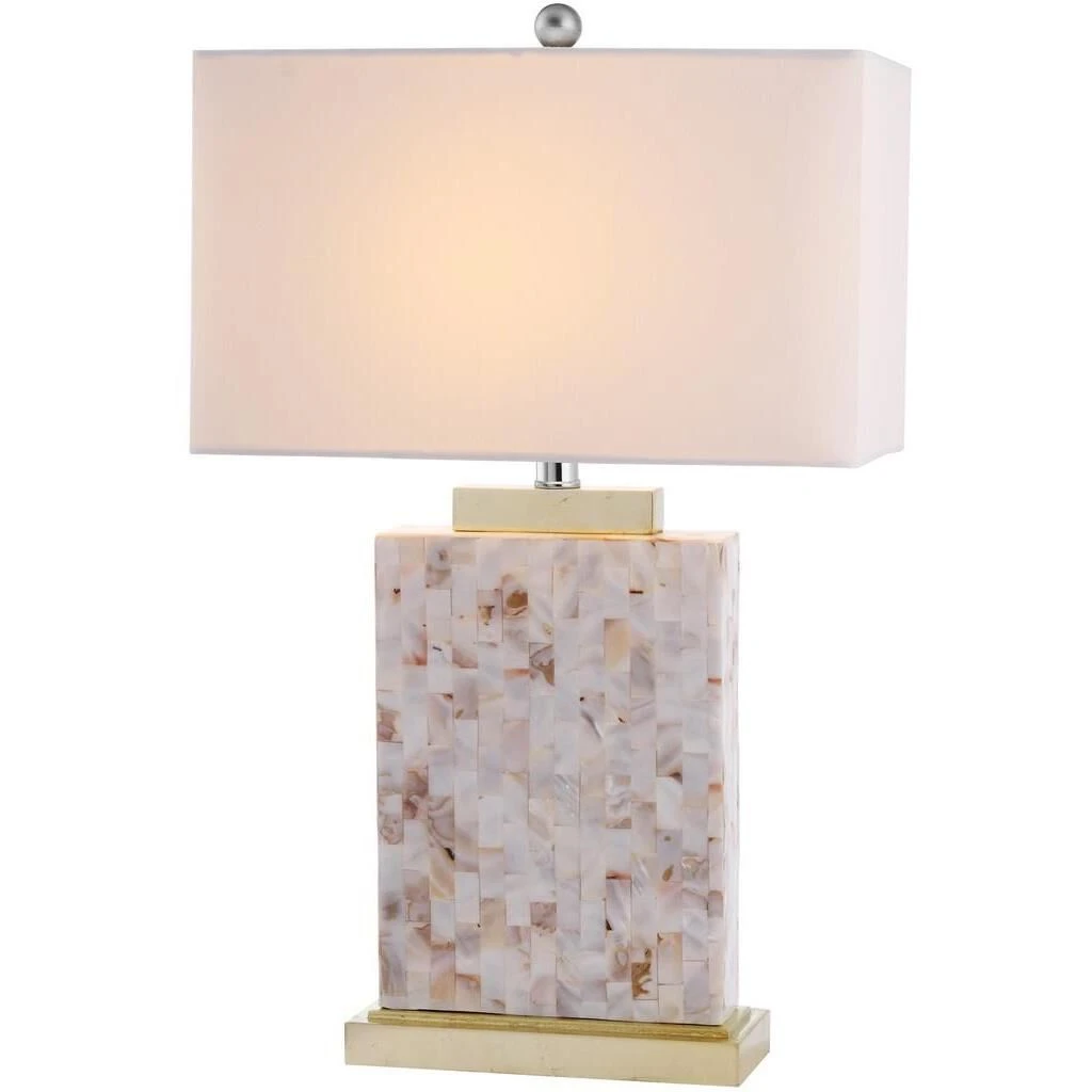 Architectural in its graphic simplicity, the Tory Shell Table Lamps columnar base is artfully adorned with mosaic capiz shells and complemented by a transitional rectangular Geneva white shade. With brushed gold stand and fittings, this lamp casts an elegant glow in living room, hall or bedroom.