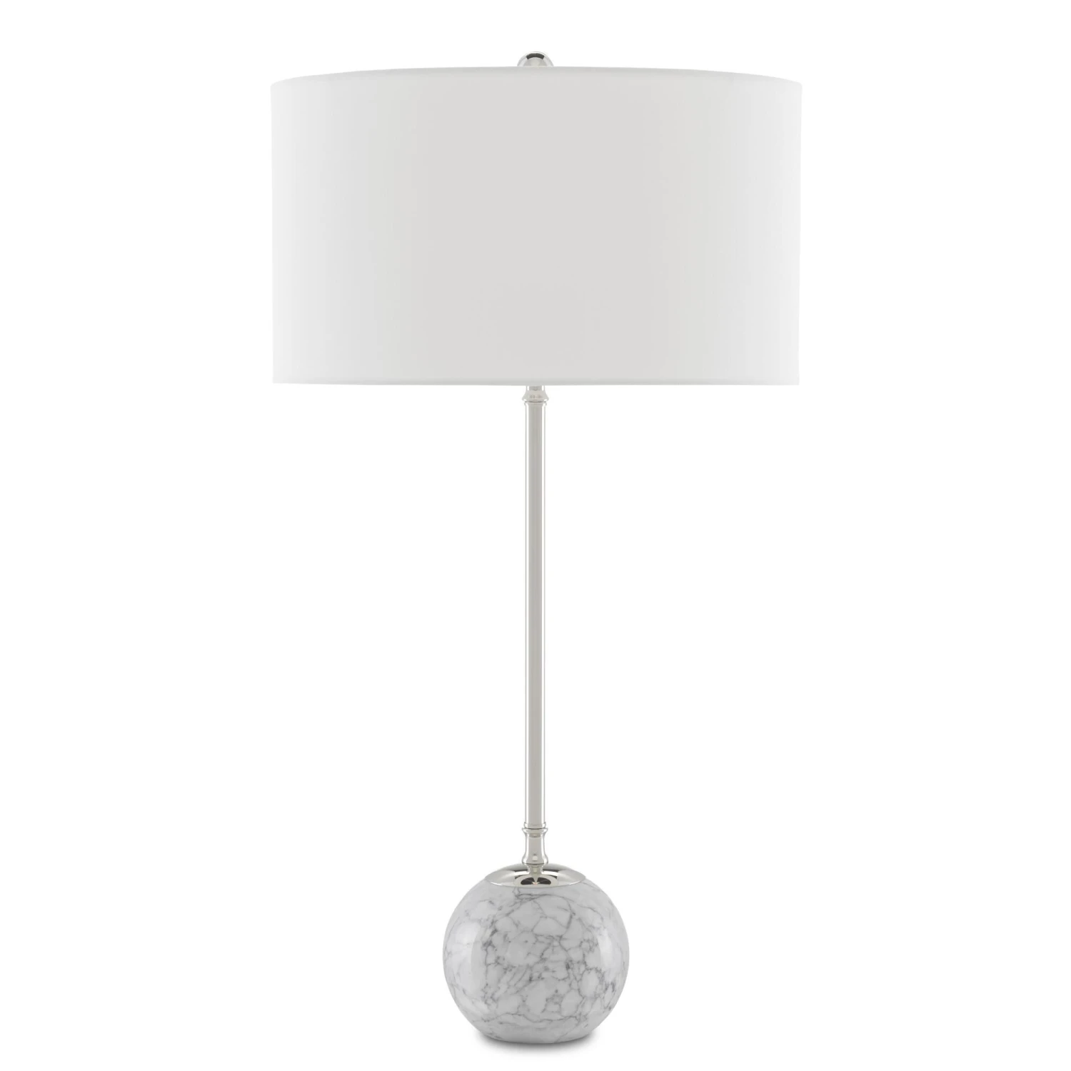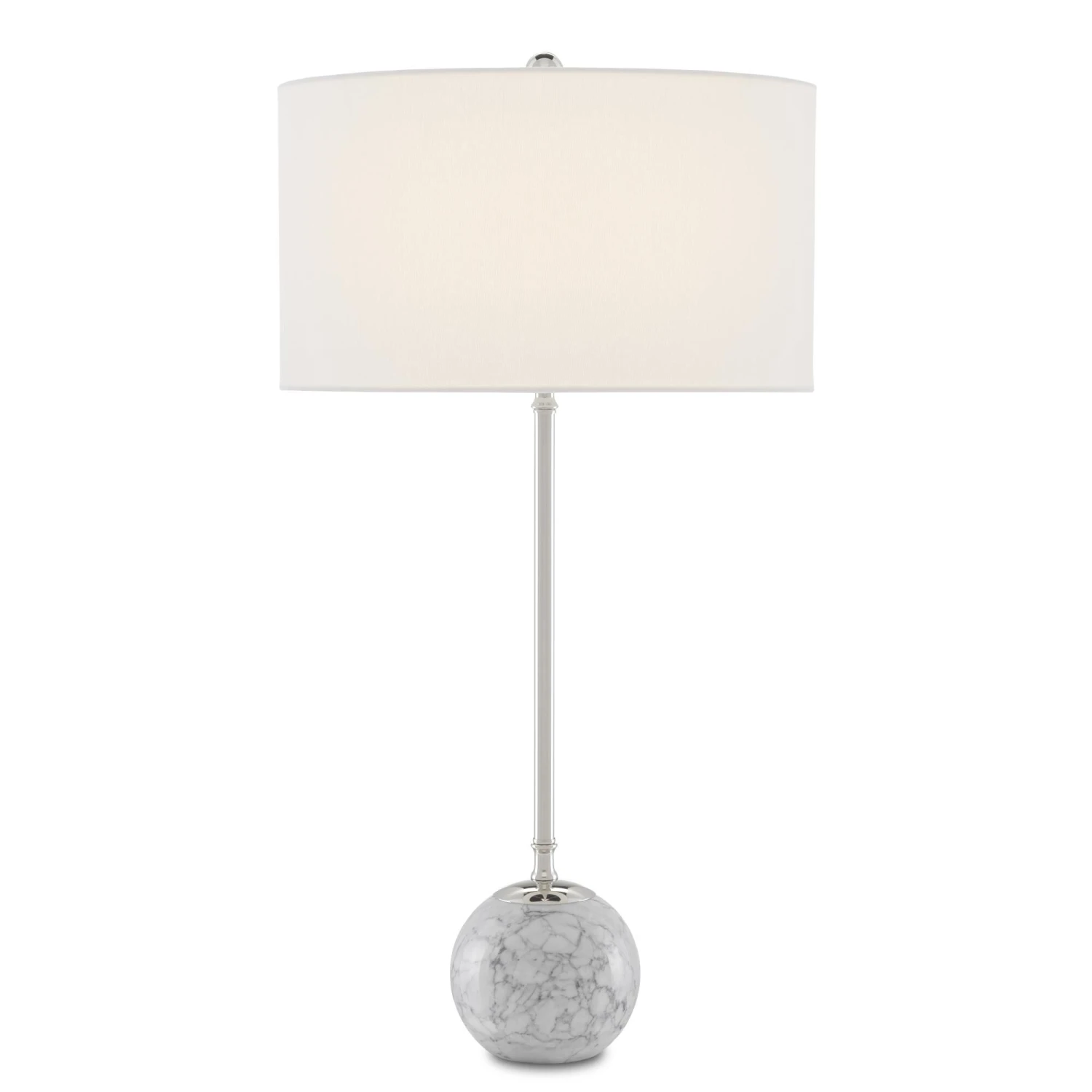 Extending daintily from a ball of white marble with gray veining, the thin stem of the Villette White Table Lamp is made of metal in a polished nickel finish. At the very spot where the bone linen shade culminates at its bottom-most point and just above the base are the subtlest of accents that bring this white and silver table lamp its sophistication and charm. Tom Caldwell designed the Villette, which we also offer in a black version.